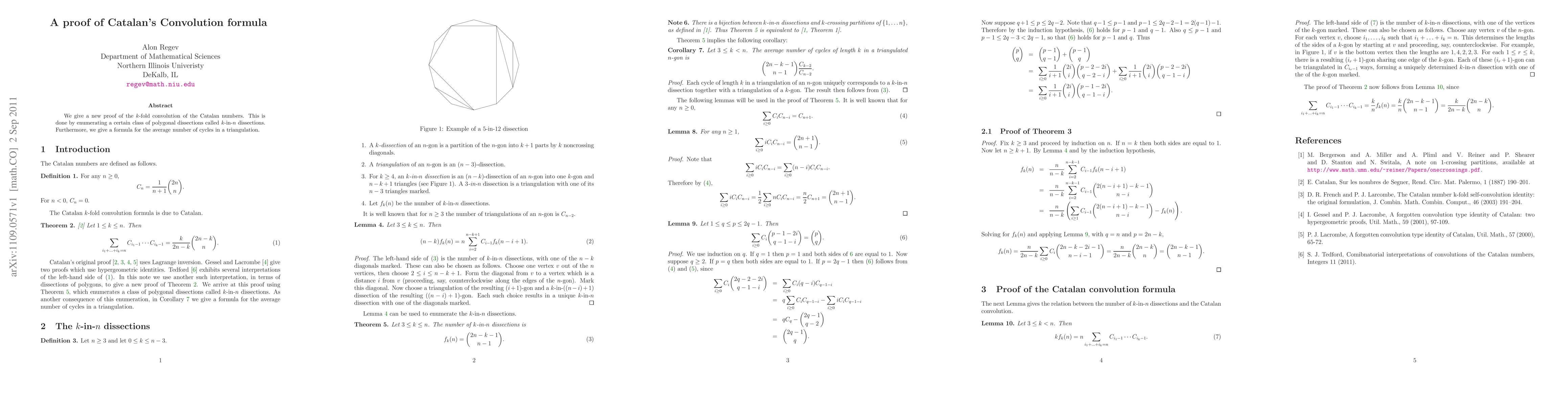 We give a new proof of the $k$-fold convolution of the Catalan numbers. This is done by enumerating a certain class of polygonal dissections called $k$-in-$n$ dissections. Furthermore, we give a formula for the average number of cycles in a triangulation.
