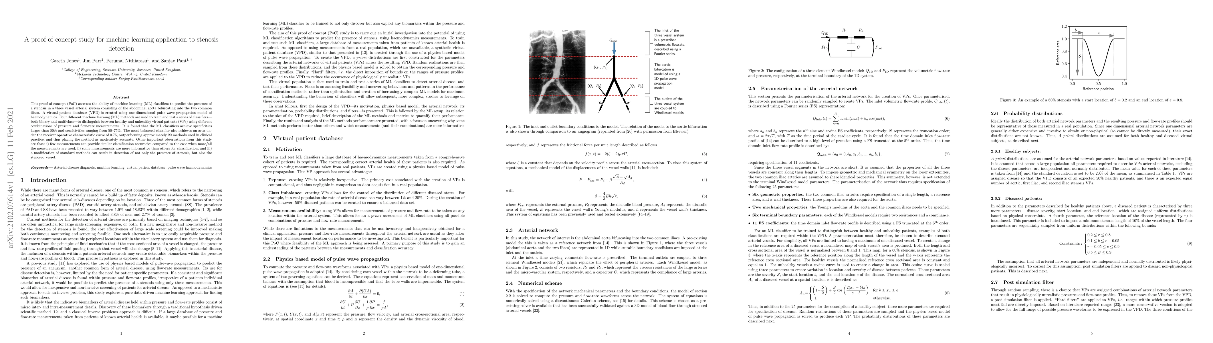This proof of concept (PoC) assesses the ability of machine learning (ML) classifiers to predict the presence of a stenosis in a three vessel arterial system consisting of the abdominal aorta bifurcating into the two common iliacs. A virtual patient database (VPD) is created using one-dimensional pulse wave propagation model of haemodynamics. Four different machine learning (ML) methods are used to train and test a series of classifiers -- both binary and multiclass -- to distinguish between healthy and unhealthy virtual patients (VPs) using different combinations of pressure and flow-rate measurements. It is found that the ML classifiers achieve specificities larger than 80% and sensitivities ranging from 50-75%. The most balanced classifier also achieves an area under the receiver operative characteristic curve of 0.75, outperforming approximately 20 methods used in clinical practice, and thus placing the method as moderately accurate. Other important observations from this study are that: i) few measurements can provide similar classification accuracies compared to the case when more/all the measurements are used; ii) some measurements are more informative than others for classification; and iii) a modification of standard methods can result in detection of not only the presence of stenosis, but also the stenosed vessel.