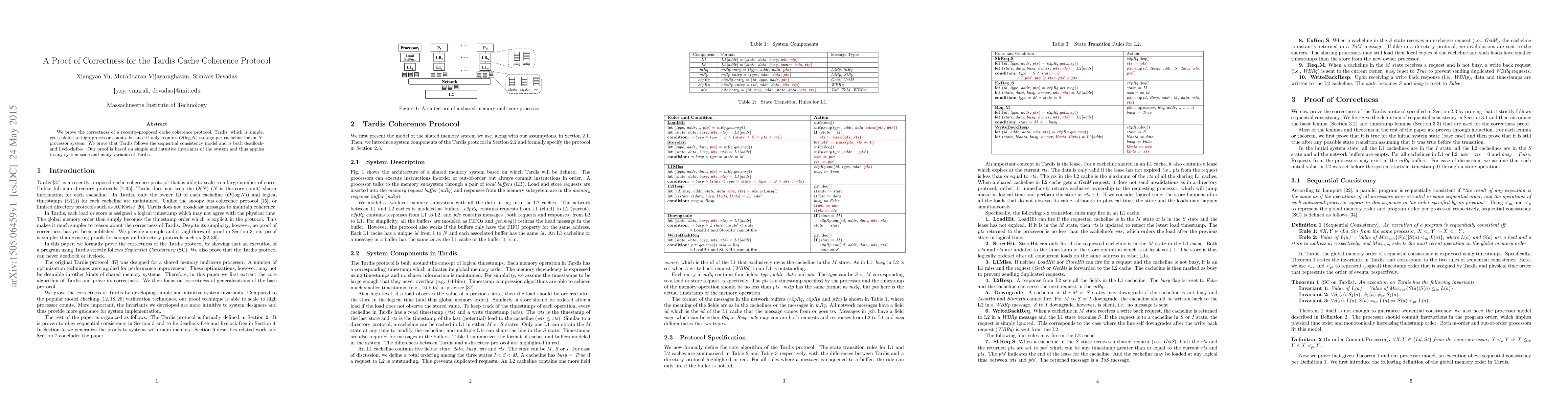 This paper proves the correctness of the Tardis cache coherence protocol, demonstrating it follows the sequential consistency model and is free from deadlocks and livelocks. The protocol requires O(logN) storage per cacheline, making it scalable for high processor counts.