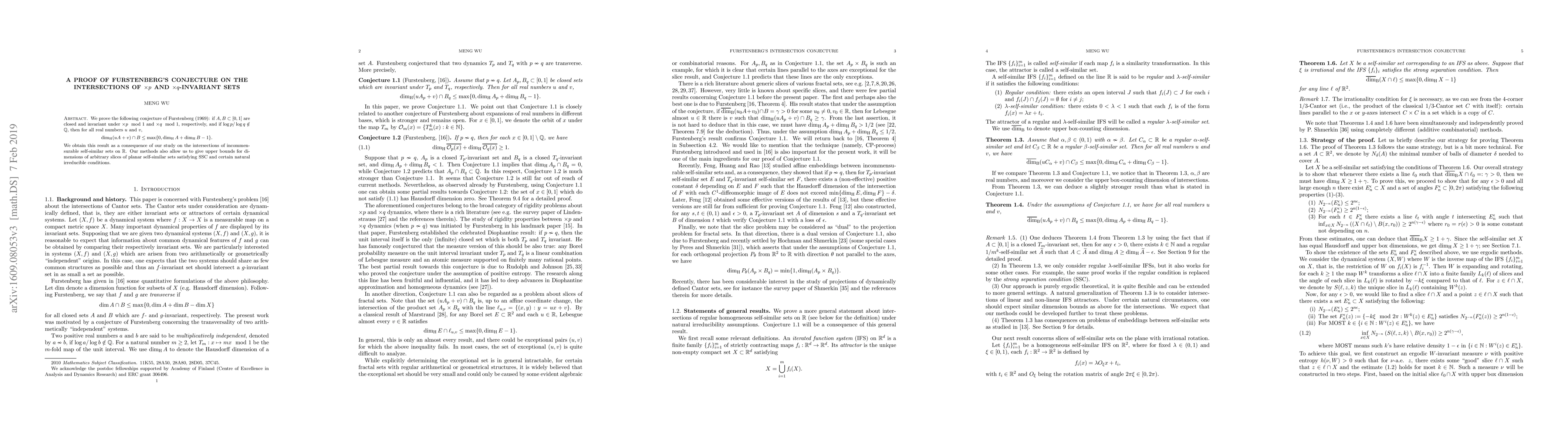 This paper proves Furstenberg's conjecture regarding the Hausdorff dimension of intersections of $\times p$ and $\times q$-invariant sets, showing that their combined dimension cannot exceed the maximum of zero or the sum of their individual dimensions minus one, provided $p$ and $q$ are incommensurable. The proof leverages the study of intersections of incommensurable self-similar sets.