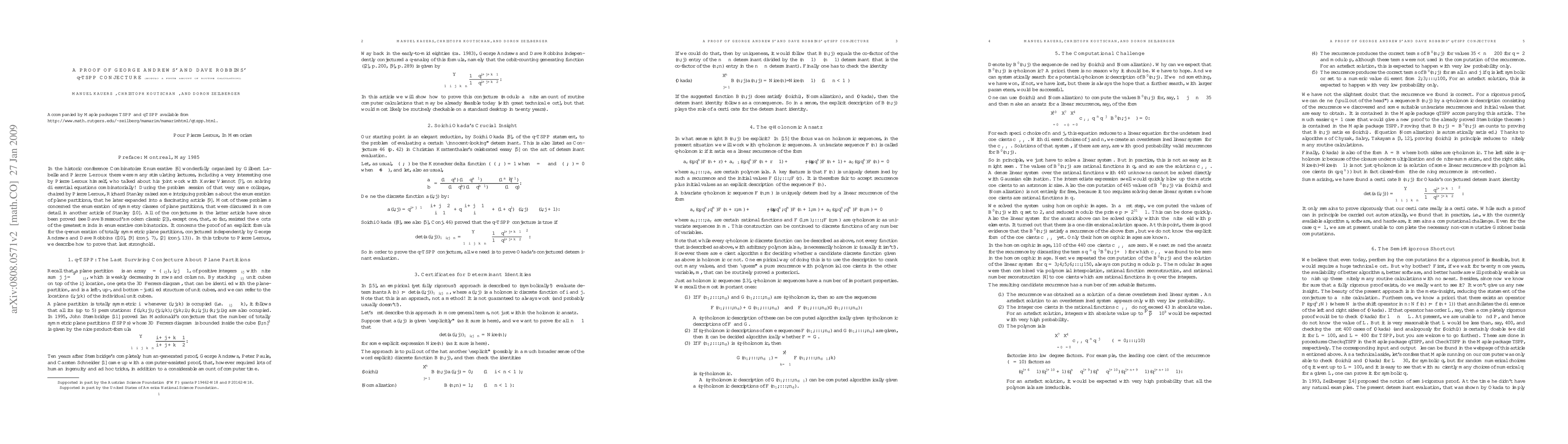 In the historic conference Combinatoire Enumerative[LL] wonderfully organized by Gilbert Labelle and Pierre Leroux there were many stimulating lectures, including a very interesting one by Pierre Leroux himself, who talked about his joint work with Xavier Viennot[LV], on solving differential equations combinatorially! During the problem session of that very same colloque, chaired by Pierre Leroux, Richard Stanley raised some intriguing problems about the enumeration of plane partitions, that he later expanded into a fascinating article[Sta1]. Most of these problems concerned the enumeration of symmetry classes of plane partitions, that were discussed in more detail in another article of Stanley[Sta2]. All of the conjectures in the latter article have since been proved (see Dave Bressoud's modern classic[B]), except one, that, so far, resisted the efforts of the greatest minds in enumerative combinatorics. It concerns the proof of an explicit formula for the q-enumeration of totally symmetric plane partitions, conjectured independently by George Andrews and Dave Robbins([Sta2],[Sta1](conj. 7), [B](conj. 13)). In this tribute to Pierre Leroux, we describe how to prove that last stronghold.
