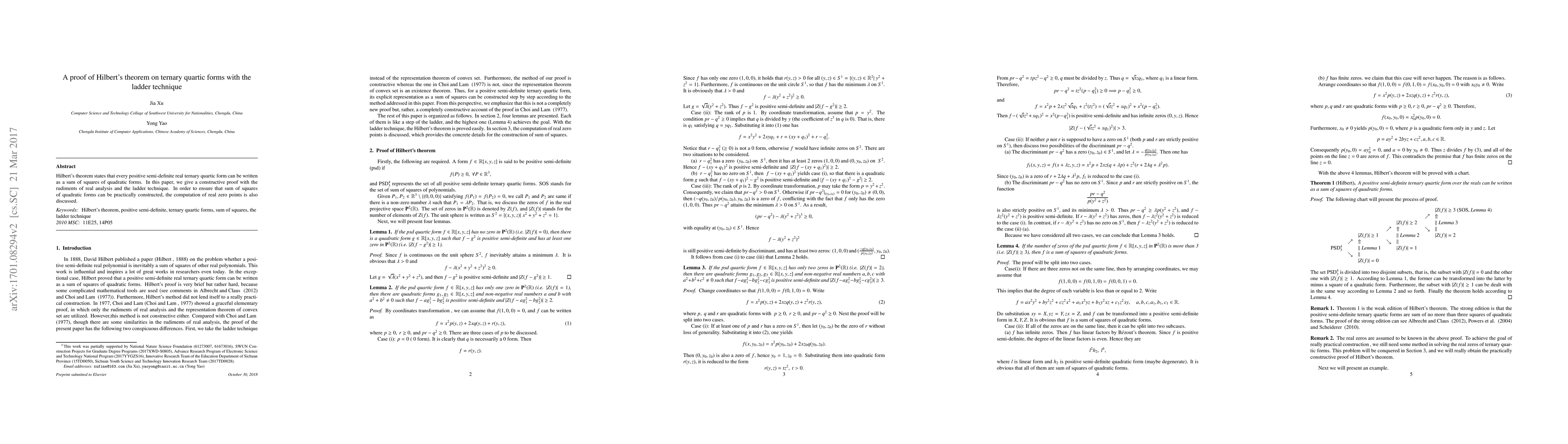 This paper proves Hilbert's theorem on ternary quartic forms using a new technique called the ladder method, providing a constructive approach to the long-standing problem.