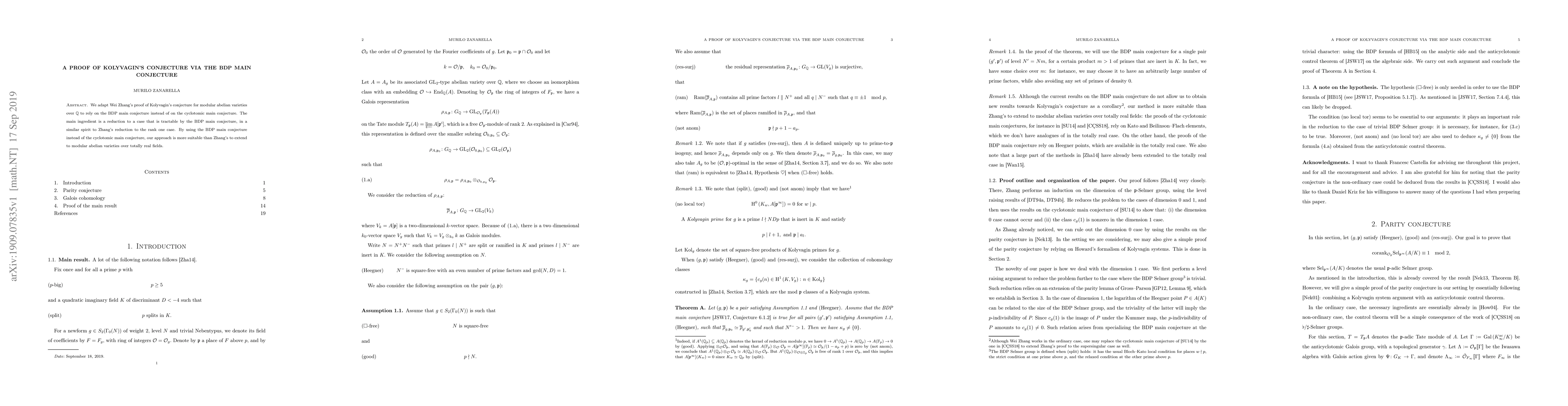 This paper adapts Wei Zhang's proof of Kolyvagin's conjecture for modular abelian varieties over $\mathbb{Q}$ by relying on the BDP main conjecture instead of the cyclotomic main conjecture, making it more extendable to varieties over totally real fields. The key method involves reducing the problem to a case manageable by the BDP main conjecture.
