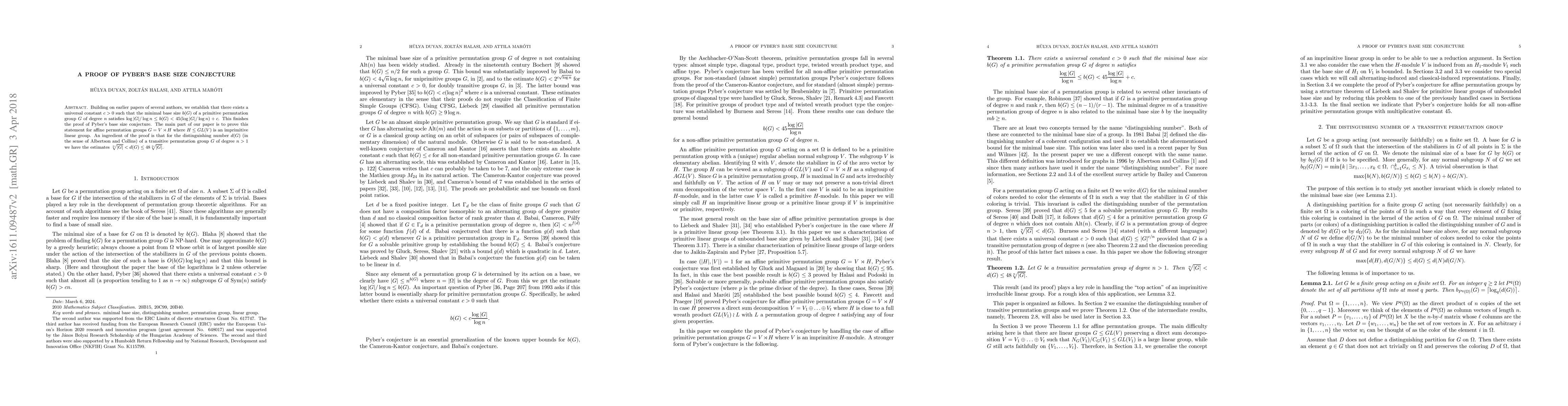 Summary: This paper proves Pyber's base size conjecture by establishing a universal constant $c > 0$ such that the minimal base size $b(G)$ of a primitive permutation group $G$ satisfies $\log |G| / \log n \leq b(G) < 45 (\log |G| / \log n) + c$. The proof also provides estimates for the distinguishing number $d(G)$ of a transitive permutation group $G$.