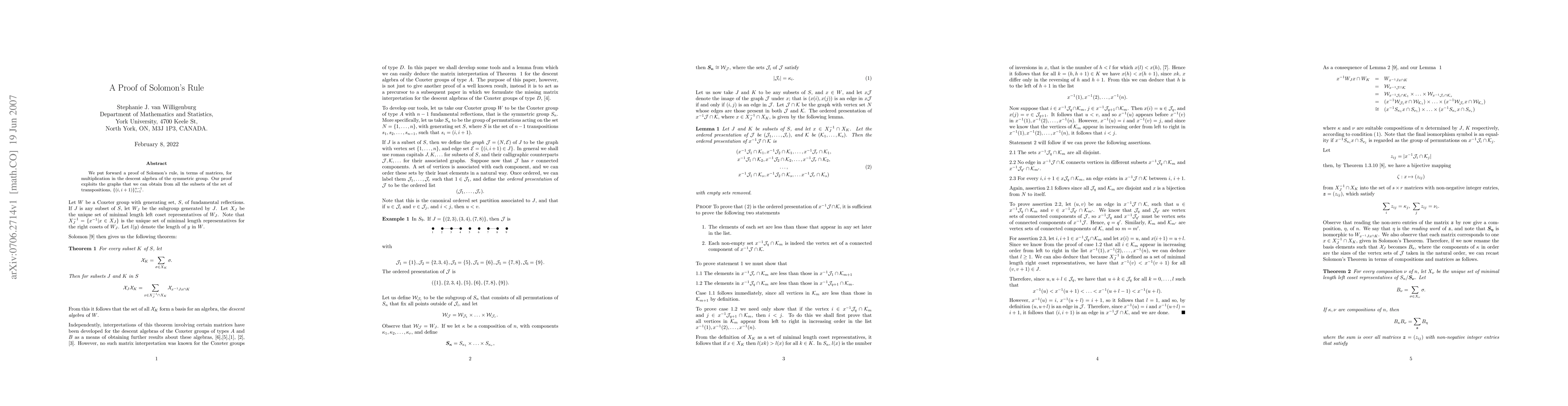 Title: A Proof of Solomon's Rule Summary: This paper provides a matrix-based proof of Solomon's rule for multiplication in the descent algebra of the symmetric group, leveraging graphs derived from subsets of transpositions.