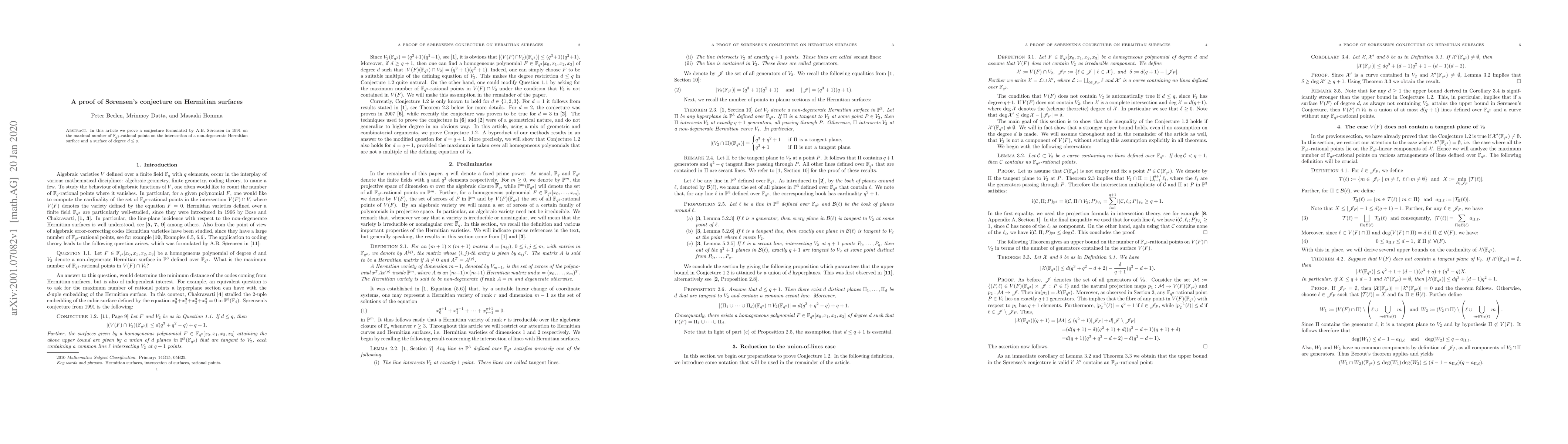 In this article we prove a conjecture formulated by A.B. Soerensen in 1991 on the maximal number of $\mathbb{F}_{q^2}$-rational points on the intersection of a non-degenerate Hermitian surface and a surface of degree $d \le q.$