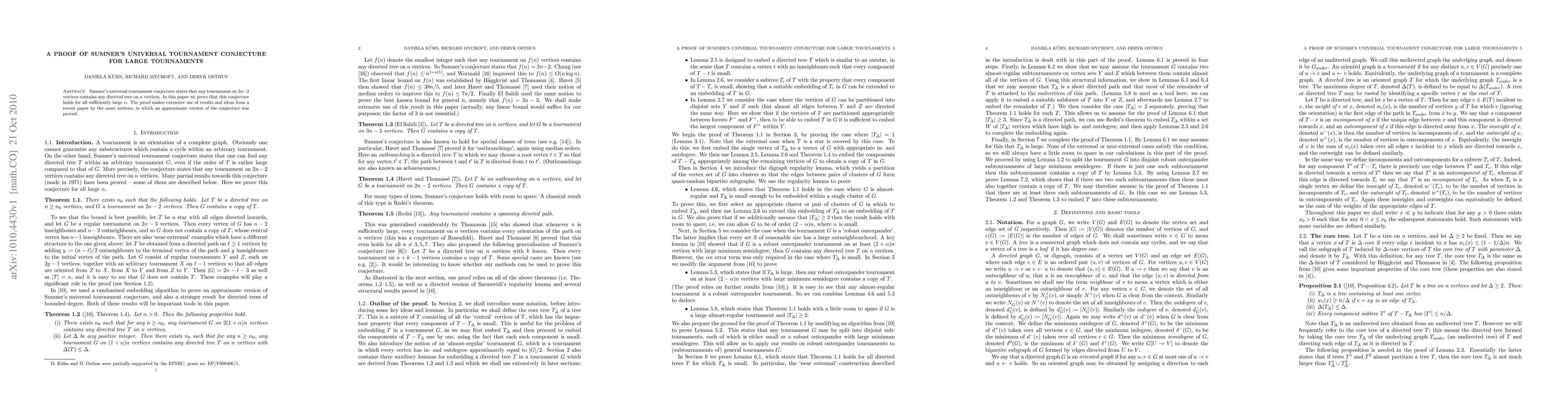 Researchers prove Sumner's universal tournament conjecture for large tournaments, showing that any 2n-2 vertex tournament contains a directed tree on n vertices, valid for sufficiently large n.