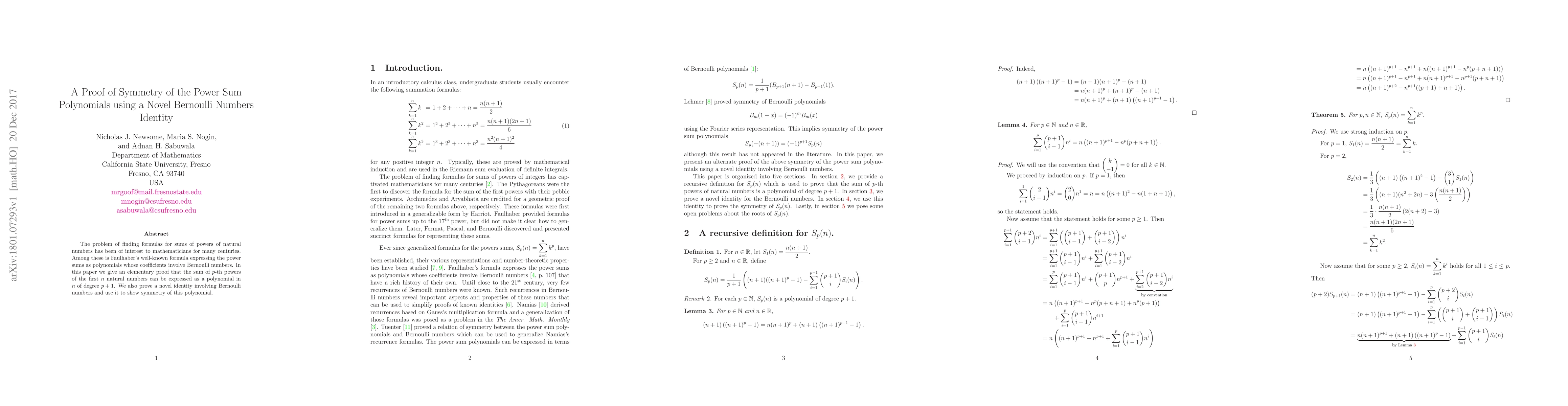 The problem of finding formulas for sums of powers of natural numbers has been of interest to mathematicians for many centuries. Among these is Faulhaber's well-known formula expressing the power sums as polynomials whose coefficients involve Bernoulli numbers. In this paper we give an elementary proof that the sum of $p$-th powers of the first $n$ natural numbers can be expressed as a polynomial in $n$ of degree $p+1$. We also prove a novel identity involving Bernoulli numbers and use it to show symmetry of this polynomial.