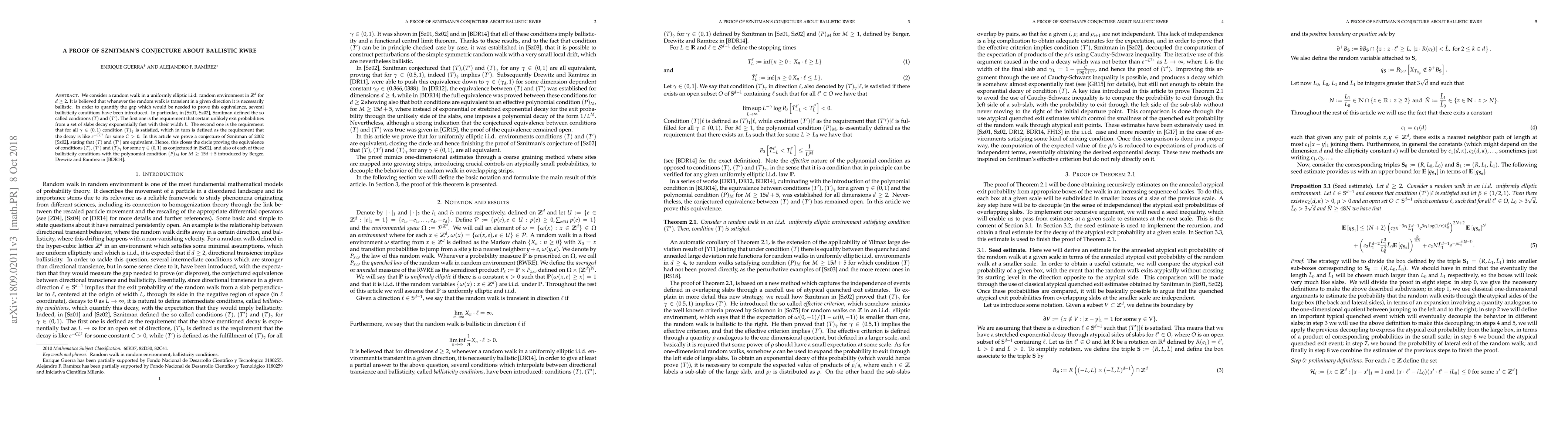 We consider a random walk in a uniformly elliptic i.i.d. random environment in $\mathbb Z^d$ for $d\ge 2$. It is believed that whenever the random walk is transient in a given direction it is necessarily ballistic. In order to quantify the gap which would be needed to prove this equivalence, several ballisticity conditions have been introduced. In particular, in 2001 and 2002, Sznitman defined the so called conditions $(T)$ and $(T')$. The first one is the requirement that certain unlikely exit probabilities from a set of slabs decay exponentially fast with their width $L$. The second one is the requirement that for all $\gamma\in (0,1)$ condition $(T)_\gamma$ is satisfied, which in turn is defined as the requirement that the decay is like $e^{-CL^\gamma}$ for some $C>0$. In this article we prove a conjecture of Sznitman of 2002, stating that $(T)$ and $(T')$ are equivalent. Hence, this closes the circle proving the equivalence of conditions $(T)$, $(T')$ and $(T)_\gamma$ for some $\gamma\in (0,1)$ as conjectured by Sznitman, and also of each of these ballisticity conditions with the polynomial condition $(P)_M$ for $M\ge 15d+5$ introduced by Berger, Drewitz and Ramirez in 2014.