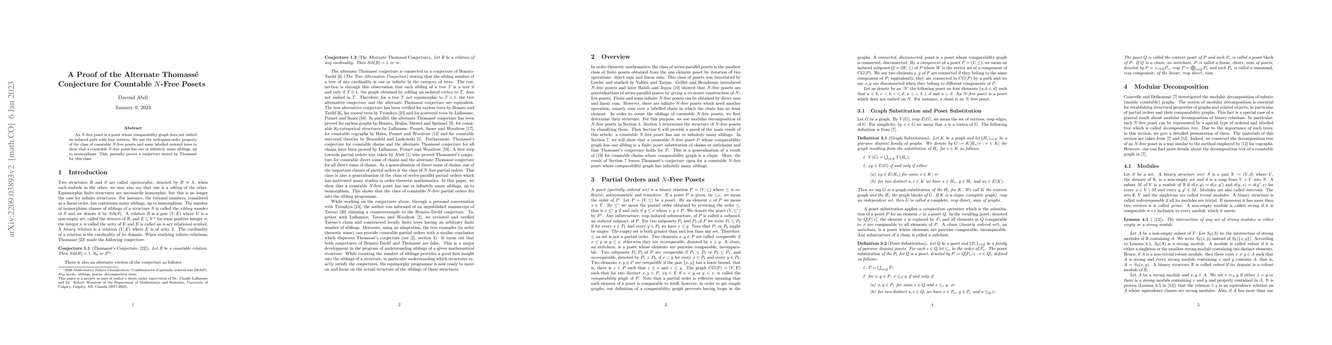 An $N$-free poset is a poset whose comparability graph does not embed an induced path with four vertices. We use the well-quasi-order property of the class of countable $N$-free posets and some labelled ordered trees to show that a countable $N$-free poset has one or infinitely many siblings, up to isomorphism. This, partially proves a conjecture stated by Thomass\'e for this class.