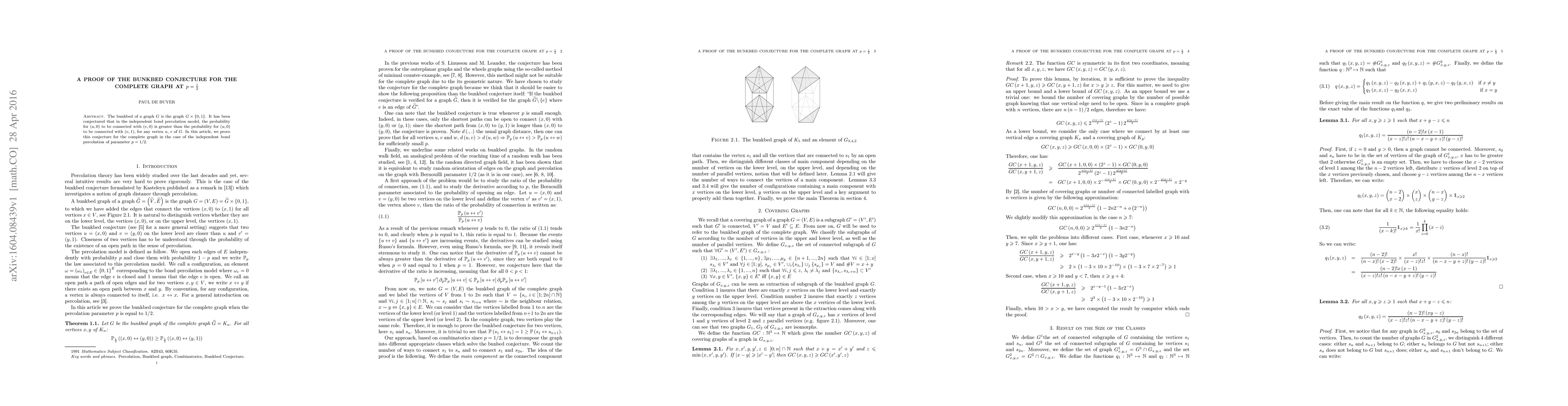 The bunkbed of a graph $G$ is the graph $G\times K_2 $. It has been conjectured that in the independent bond percolation model, the probability for $\left(u,0\right)$ to be connected with $\left(v,0\right)$ is greater than the probability for $\left(u,0\right)$ to be connected with $\left(v,1\right)$, for any vertex $u$, $v$ of $G$. In this article, we prove this conjecture for the complete graph in the case of the independent bond percolation of parameter $p=1/2$.