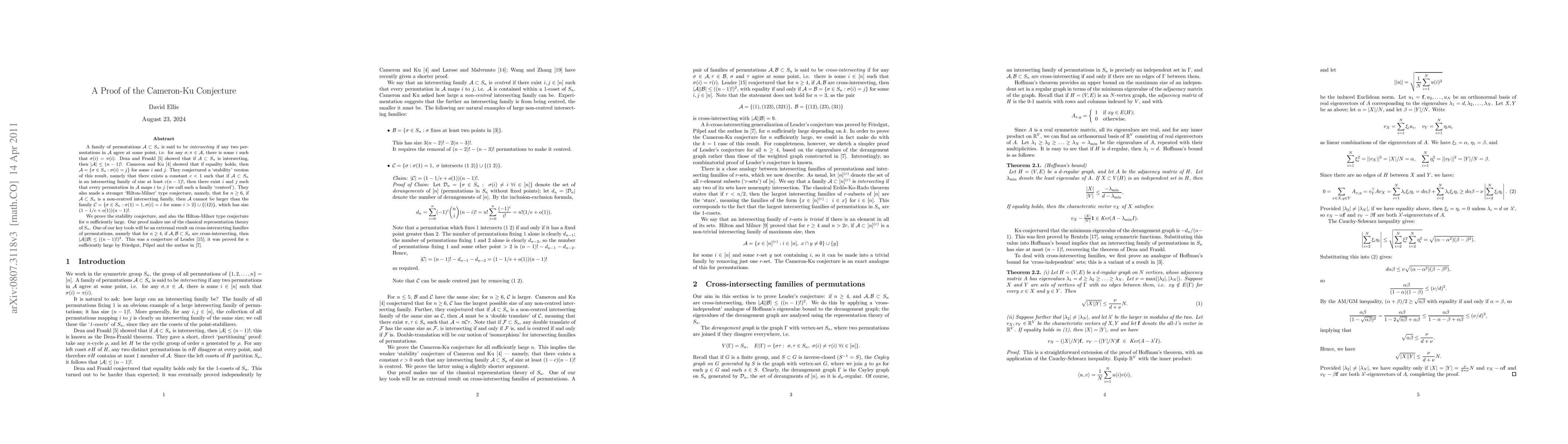 A family of permutations A \subset S_n is said to be intersecting if any two permutations in A agree at some point, i.e. for any \sigma, \pi \in A, there is some i such that \sigma(i)=\pi(i). Deza and Frankl showed that for such a family, |A| <= (n-1)!. Cameron and Ku showed that if equality holds then A = {\sigma \in S_{n}: \sigma(i)=j} for some i and j. They conjectured a `stability' version of this result, namely that there exists a constant c < 1 such that if A \subset S_{n} is an intersecting family of size at least c(n-1)!, then there exist i and j such that every permutation in A maps i to j (we call such a family `centred'). They also made the stronger `Hilton-Milner' type conjecture that for n \geq 6, if A \subset S_{n} is a non-centred intersecting family, then A cannot be larger than the family C = {\sigma \in S_{n}: \sigma(1)=1, \sigma(i)=i \textrm{for some} i > 2} \cup {(12)}, which has size (1-1/e+o(1))(n-1)!. We prove the stability conjecture, and also the Hilton-Milner type conjecture for n sufficiently large. Our proof makes use of the classical representation theory of S_{n}. One of our key tools will be an extremal result on cross-intersecting families of permutations, namely that for n \geq 4, if A,B \subset S_{n} are cross-intersecting, then |A||B| \leq ((n-1)!)^{2}. This was a conjecture of Leader; it was recently proved for n sufficiently large by Friedgut, Pilpel and the author.