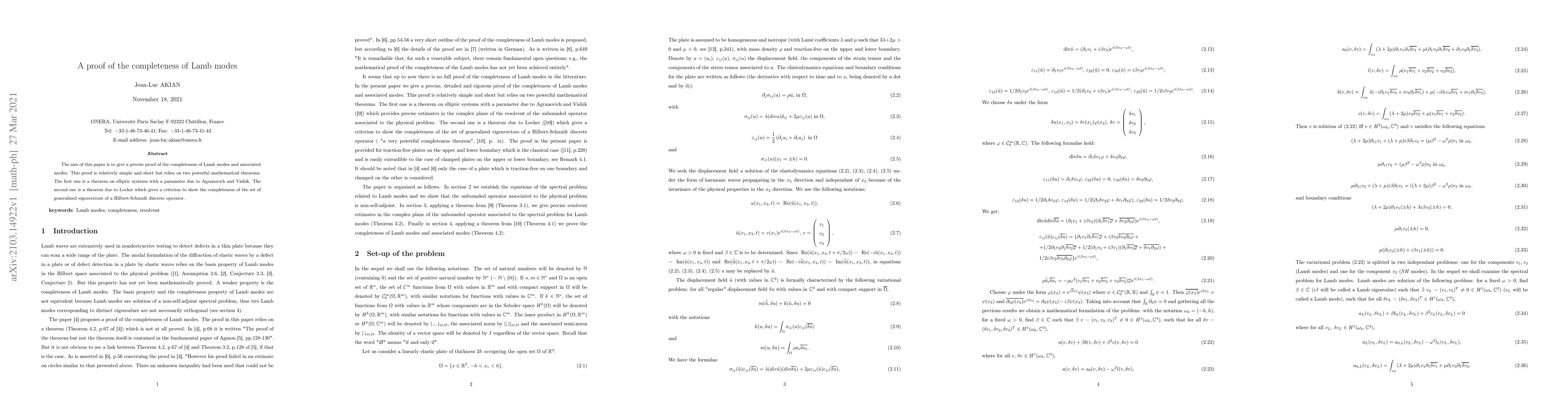 The aim of this paper is to give a precise proof of the completeness of Lamb modes and associated modes. This proof is relatively simple and short but relies on two powerful mathematical theorems. The first one is a theorem on elliptic systems with a parameter due to Agranovich and Vishik. The second one is a theorem due to Locker which gives a criterion to show the completeness of the set of generalized eigenvectors of a Hilbert-Schmidt discrete operator.