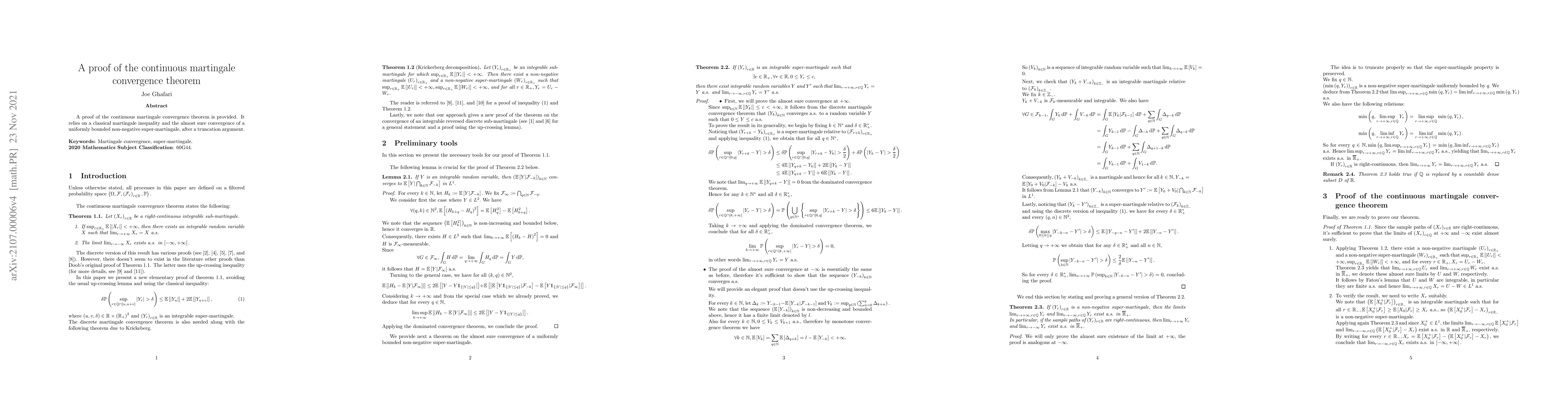 Summary: This paper proves the continuous martingale convergence theorem using a classical martingale inequality and the almost sure convergence of a uniformly bounded non-negative super-martingale, achieved through a truncation argument. The result ensures the convergence of continuous martingales under certain conditions.