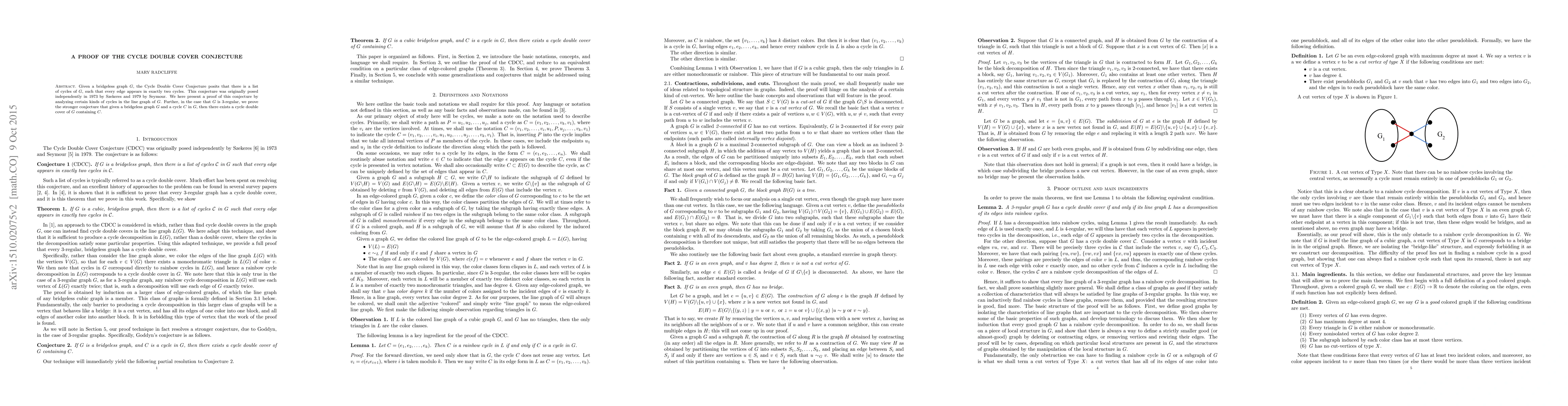 The paper proves the Cycle Double Cover Conjecture for bridgeless cubic graphs by demonstrating the existence of a list of cycles where each edge is included exactly twice. Additionally, it establishes a stronger version for cubic graphs that includes a specified cycle in the cover.