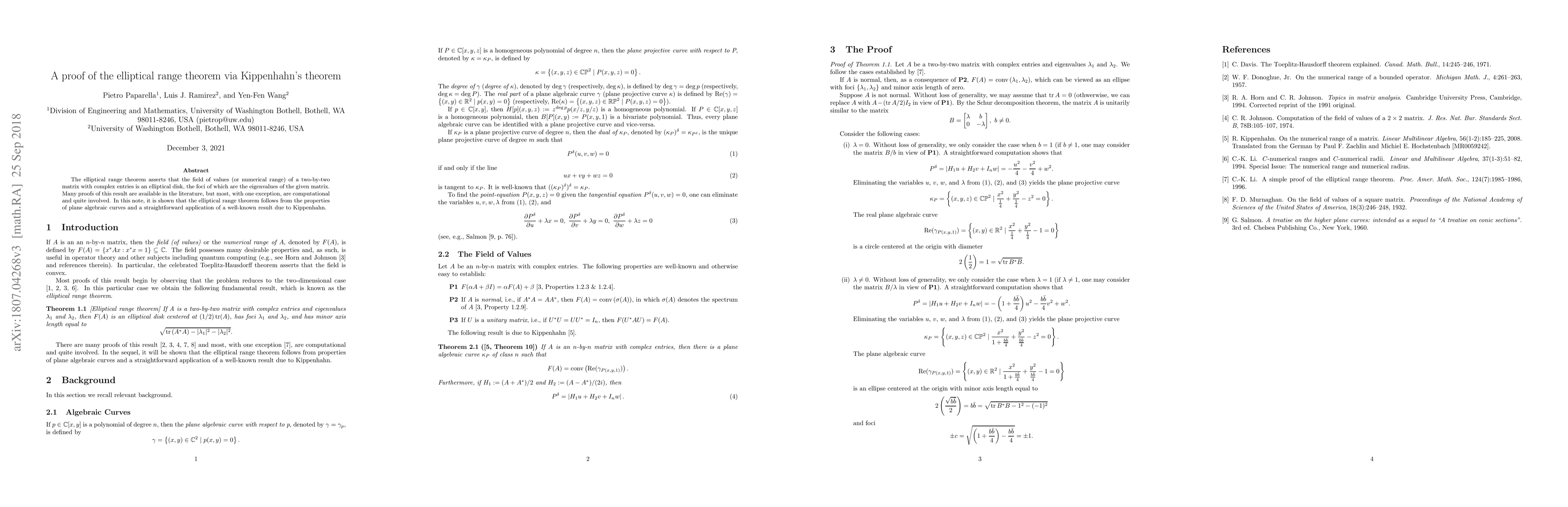 This paper demonstrates that the elliptical range theorem can be proven using plane algebraic curves and Kippenhahn's theorem, offering a more straightforward proof compared to previous computational methods.