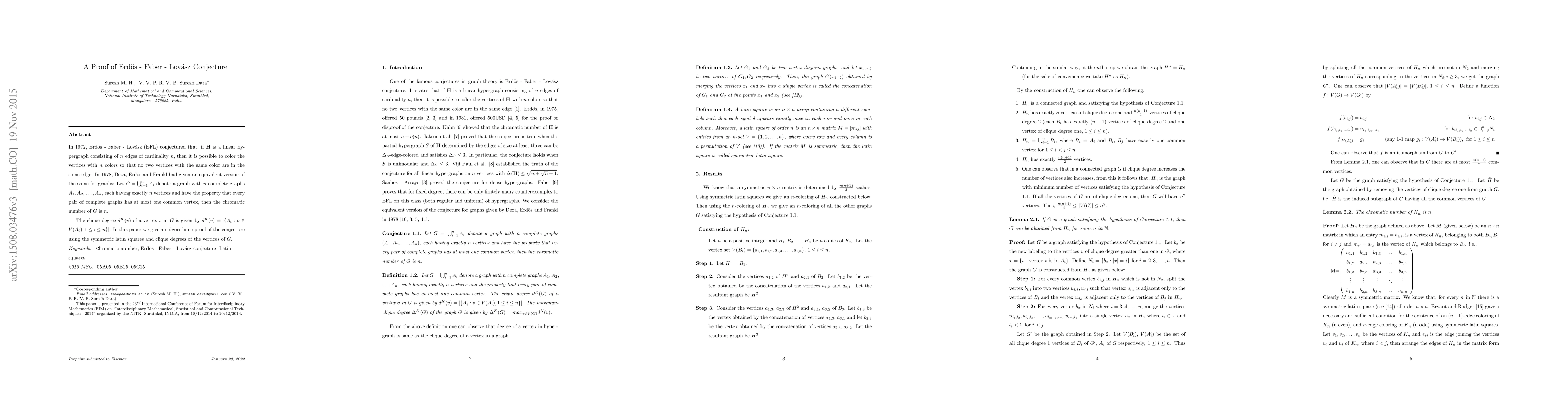 In 1972, Erd\"{o}s - Faber - Lov\'{a}sz (EFL) conjectured that, if $\textbf{H}$ is a linear hypergraph consisting of $n$ edges of cardinality $n$, then it is possible to color the vertices with $n$ colors so that no two vertices with the same color are in the same edge. In 1978, Deza, Erd\"{o}s and Frankl had given an equivalent version of the same for graphs: Let $G= \bigcup _{i=1}^{n} A_i$ denote a graph with $n$ complete graphs $A_1, A_2,$ $ \dots , A_n$, each having exactly $n$ vertices and have the property that every pair of complete graphs has at most one common vertex, then the chromatic number of $G$ is $n$. The clique degree $d^K(v)$ of a vertex $v$ in $G$ is given by $d^K(v) = |\{A_i: v \in V(A_i), 1 \leq i \leq n\}|$. In this paper we give an algorithmic proof of the conjecture using the symmetric latin squares and clique degrees of the vertices of $G$.
