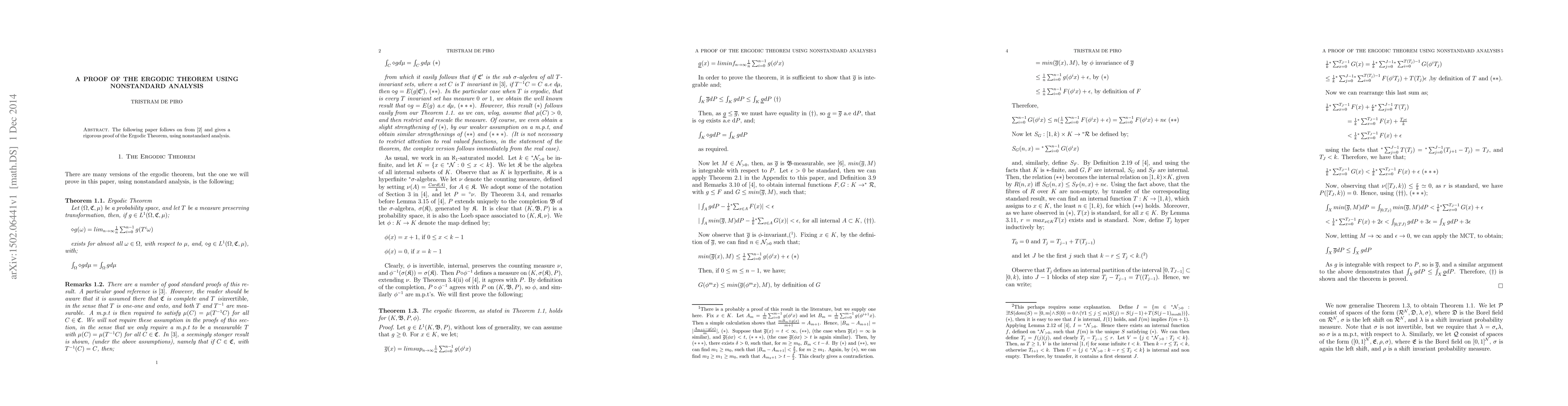Summary: This paper rigorously proves the Ergodic Theorem using nonstandard analysis, building on the foundational work of Kamae to provide a robust mathematical framework.