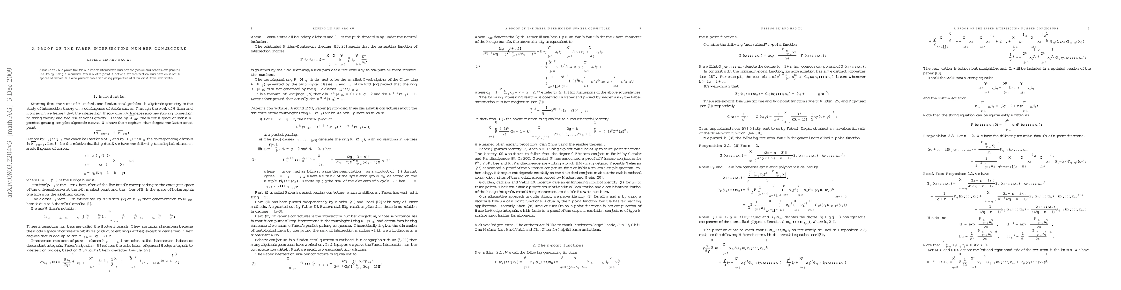 The paper proves the long-standing Faber intersection number conjecture using recursion formulas for $n$-point functions on moduli spaces of curves and discusses vanishing properties of Gromov-Witten invariants.
