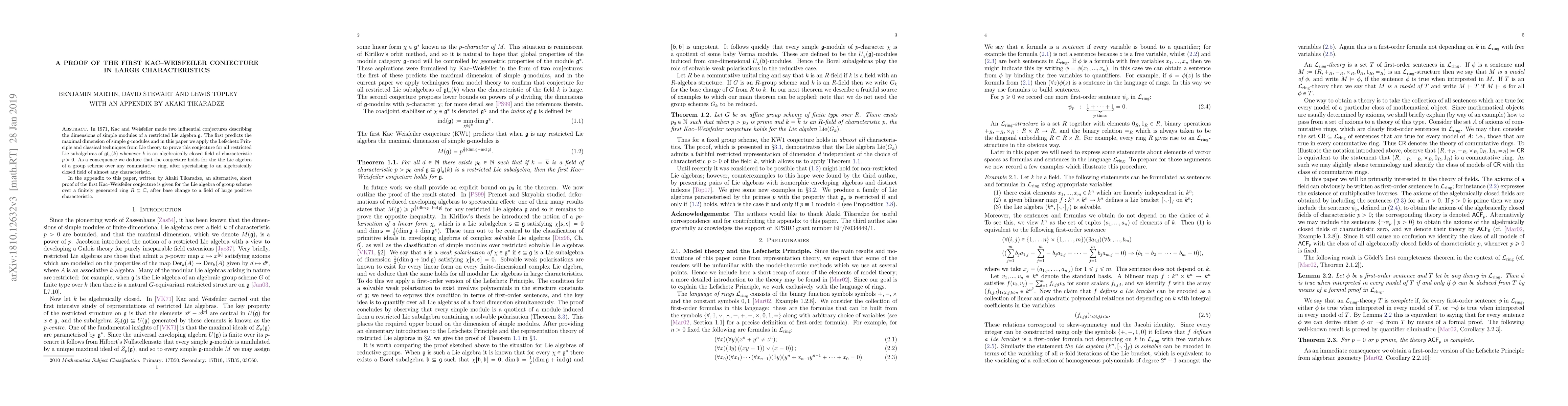 The application of the Lefschetz principle in conjunction with classical Lie theory to prove the first Kac-Weisfeiler conjecture for restricted Lie subalgebras in large characteristics.