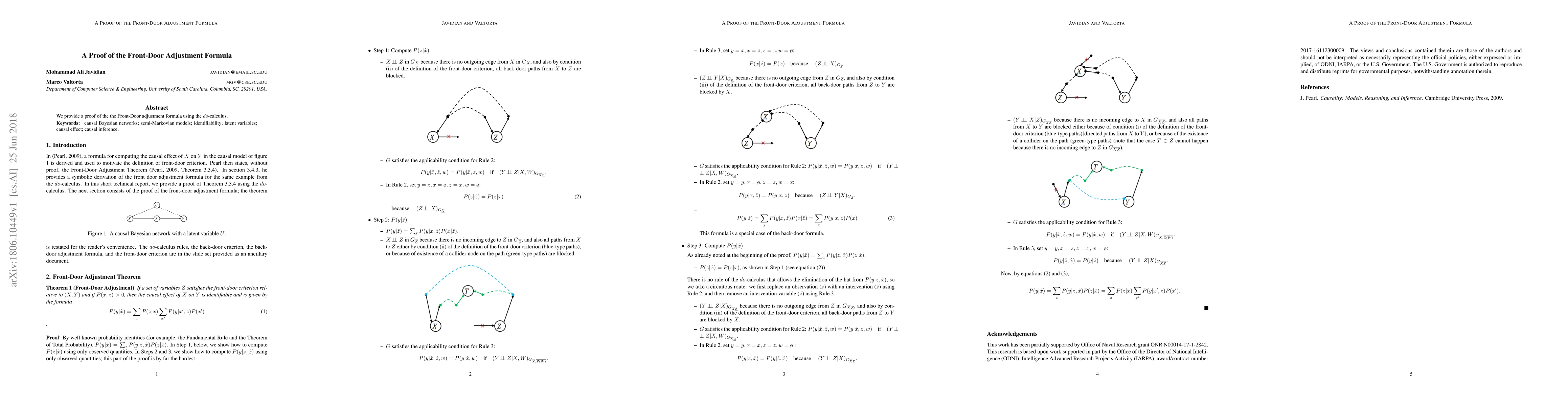 Summary: This paper presents a rigorous proof of the Front-Door adjustment formula using the do-calculus, a framework for causal inference based on interventions. The proof solidifies the formula's theoretical underpinnings in causal analysis.
