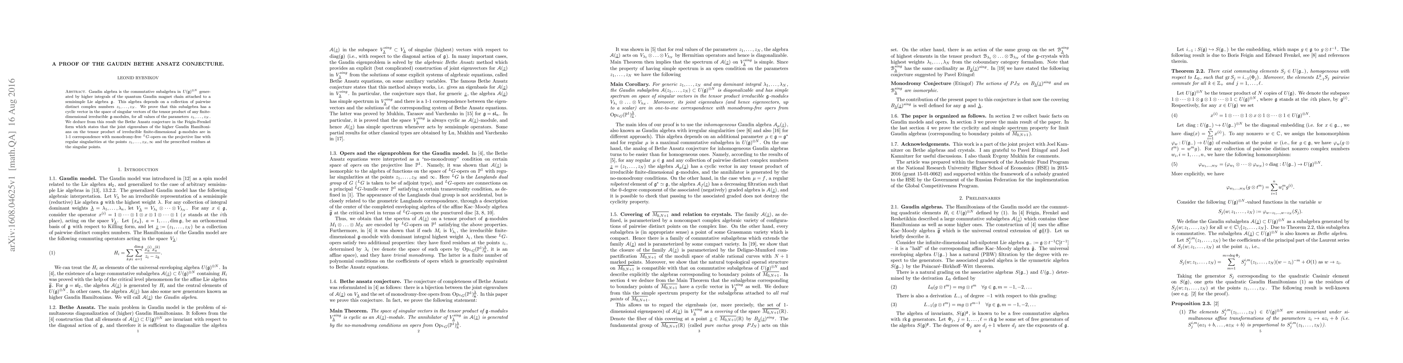 The paper proves the Gaudin Bethe Ansatz conjecture by showing that a specific algebra has a cyclic vector in certain tensor products of irreducible modules, leading to a one-to-one correspondence between higher eigenvalues and monodromy-free opers.