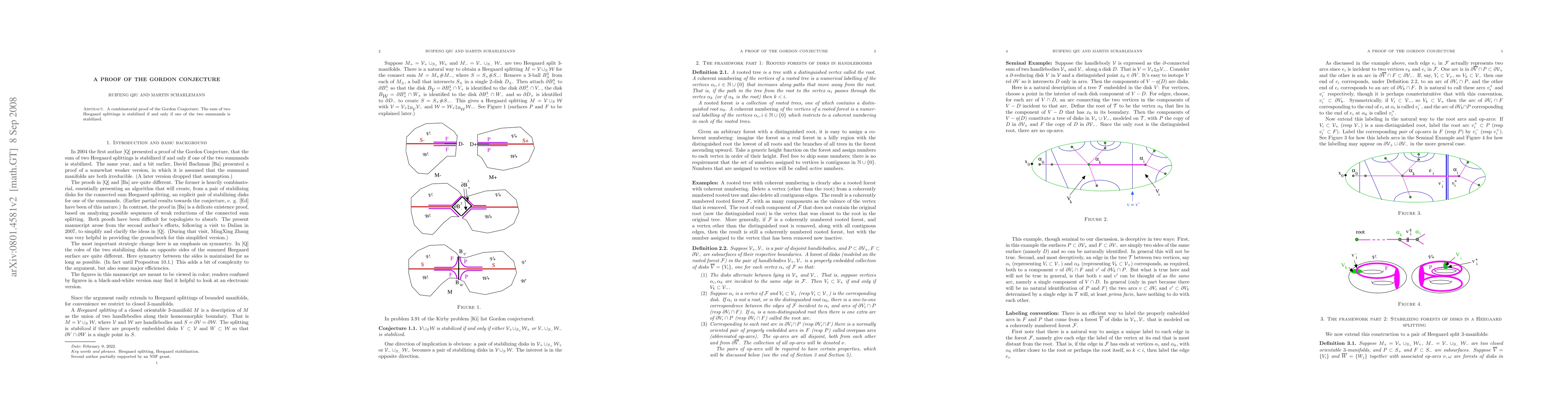 The paper presents a combinatorial proof of the Gordon Conjecture, utilizing properties of op-arcs and their stabilizing disks, along with constructions of new surfaces and pairings.