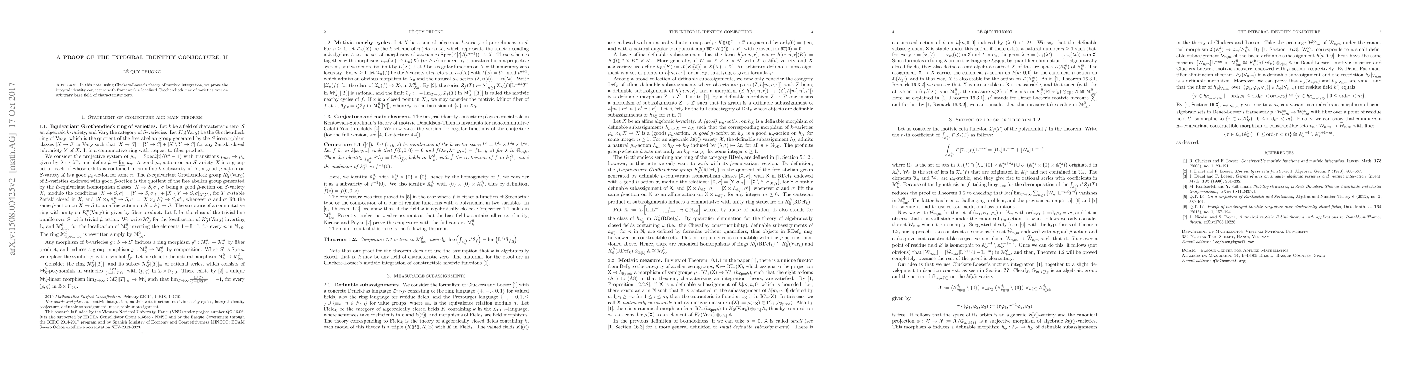 This paper proves the integral identity conjecture using Cluckers-Loeser's motivic integration theory, focusing on a localized Grothendieck ring of varieties over any base field of characteristic zero. The result extends the applicability of the conjecture to a broader mathematical context.