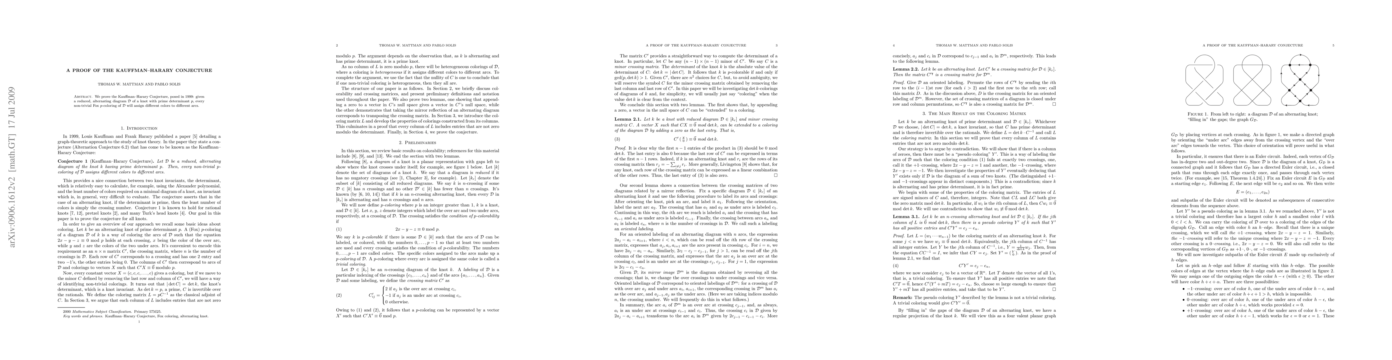 The paper proves the Kauffman-Harary Conjecture, confirming that in a reduced, alternating knot diagram with a prime determinant, each non-trivial Fox p-coloring assigns distinct colors to different arcs. This resolves a long-standing question in knot theory.