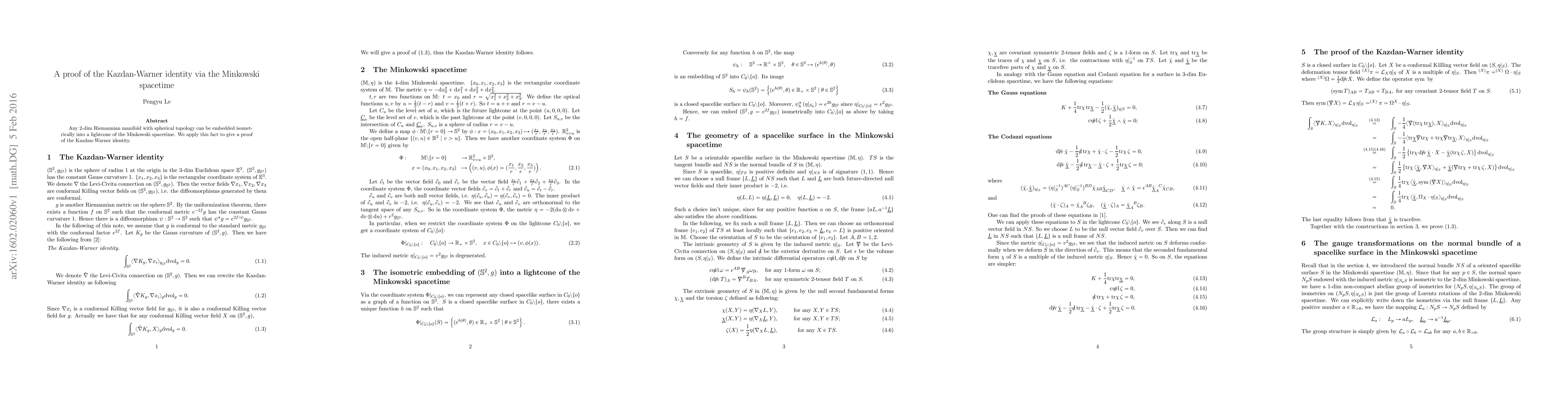 Any 2-dim Riemannian manifold with spherical topology can be embedded isometrically into a lightcone of the Minkowski spacetime. We apply this fact to give a proof of the Kazdan-Warner identity.
