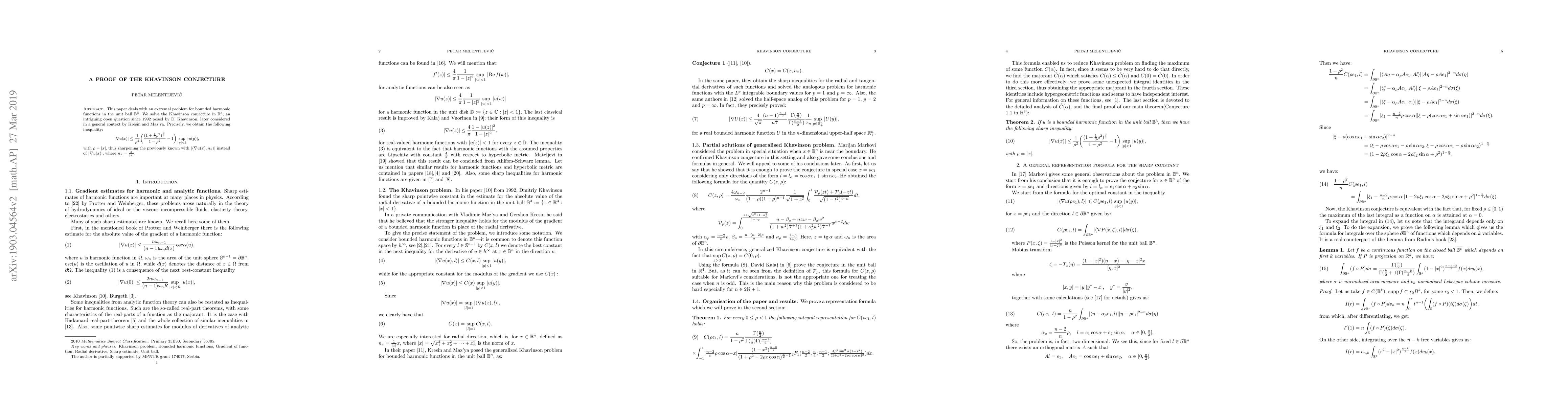 \begin{abstract} This paper deals with an extremal problem for bounded harmonic functions in the unit ball $\mathbb{B}^n.$ We solve the Khavinson conjecture in $\mathbb{R}^3,$ an intriguing open question since 1992 posed by D. Khavinson, later considered in a general context by Kresin and Maz'ya. Precisely, we obtain the following inequality: $$|\nabla u(x)|\leq \frac{1}{\rho^2}\bigg({\frac{(1+\frac{1}{3}\rho^2)^{\frac{3}{2}}}{1-\rho^2}-1}\bigg) \sup_{|y|<1} |u(y)|, $$ with $\rho=|x|,$ thus sharpening the previously known with $|\langle \nabla u(x),n_{x} \rangle |$ instead of $|\nabla u(x)|, $ where $n_{x}=\frac{x}{|x|}.$ \end{abstract}