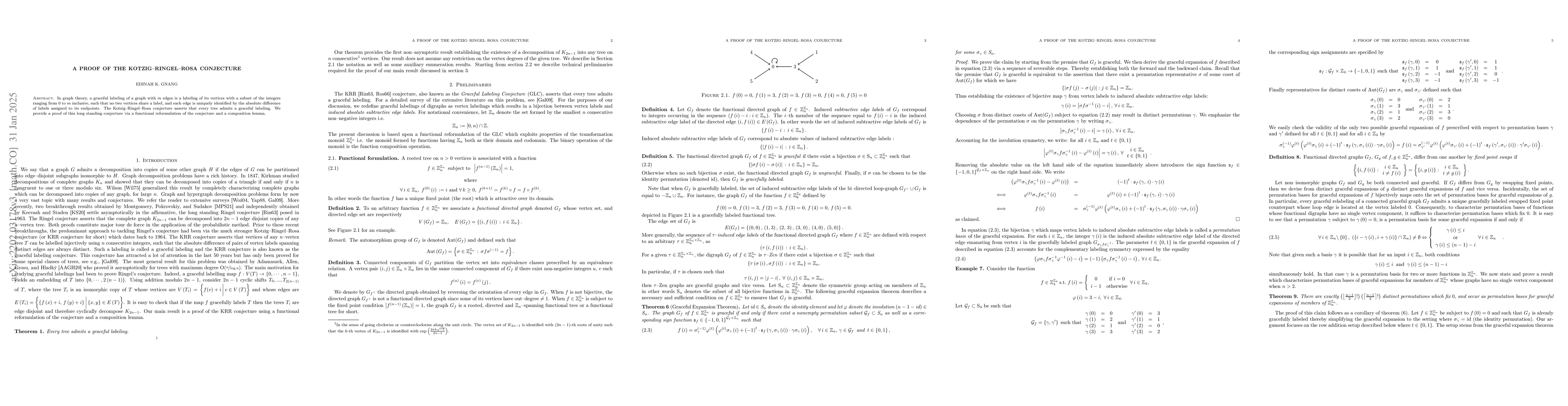 The Kotzig-Ringel-Rosa Conjecture, which posits that every tree has a graceful labeling, is proven using a functional reformulation and a composition lemma, marking a significant advancement in graph theory.