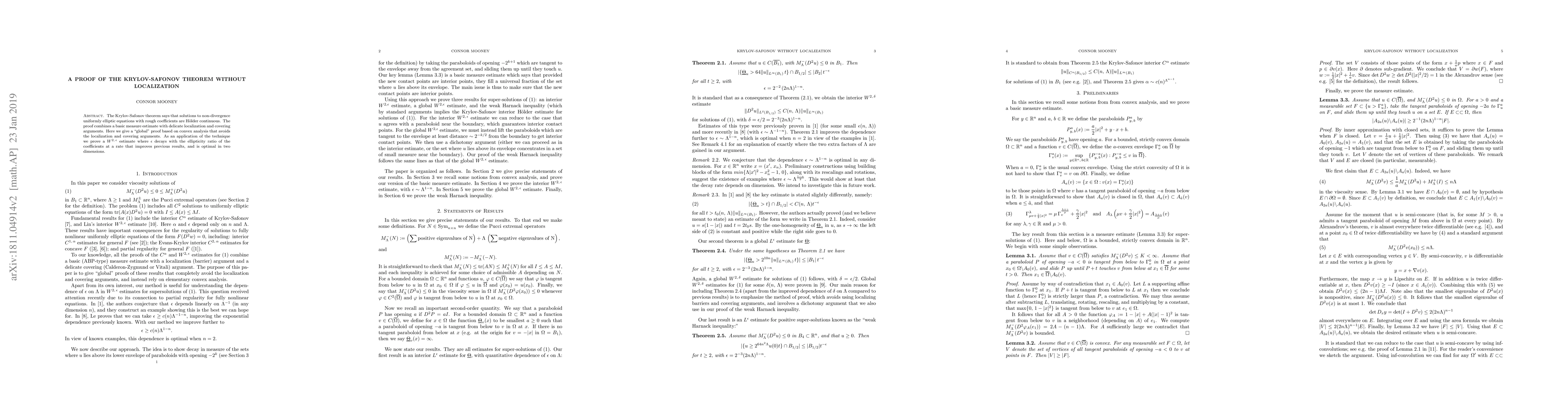 The Krylov-Safonov theorem says that solutions to non-divergence uniformly elliptic equations with rough coefficients are H\"{o}lder continuous. The proof combines a basic measure estimate with delicate localization and covering arguments. Here we give a "global" proof based on convex analysis that avoids the localization and covering arguments. As an application of the technique we prove a $W^{2,\,\epsilon}$ estimate where $\epsilon$ decays with the ellipticity ratio of the coefficients at a rate that improves previous results, and is optimal in two dimensions.