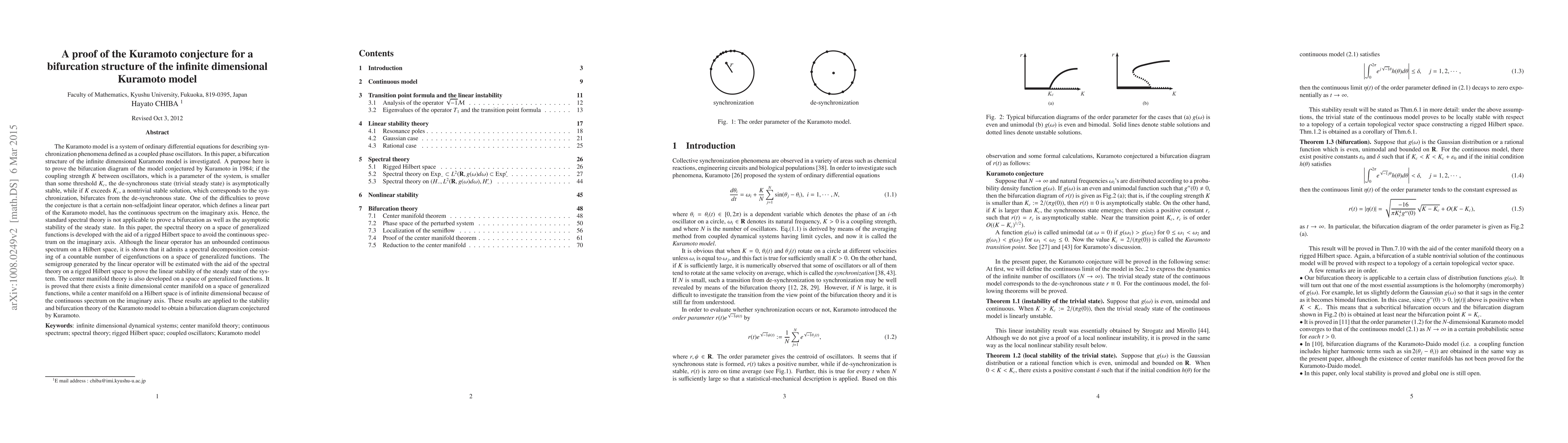 This paper proves the Kuramoto conjecture regarding the bifurcation structure of the infinite-dimensional Kuramoto model by developing spectral theory on a space of generalized functions. It demonstrates the linear stability of a steady state and constructs a finite-dimensional center manifold, leading to a bifurcation diagram that confirms Kuramoto's predictions on synchronization phenomena.