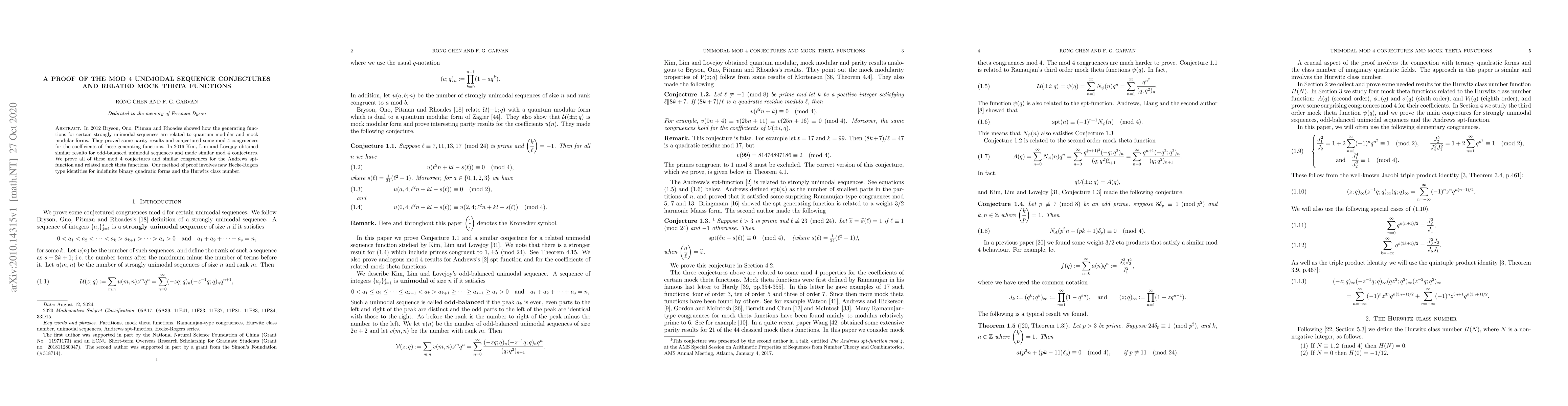 The paper proves the mod 4 unimodal sequence conjectures and related mock theta function conjectures using new Hecke-Rogers type identities and the Hurwitz class number. It extends previous results linking unimodal sequences to quantum and mock modular forms.