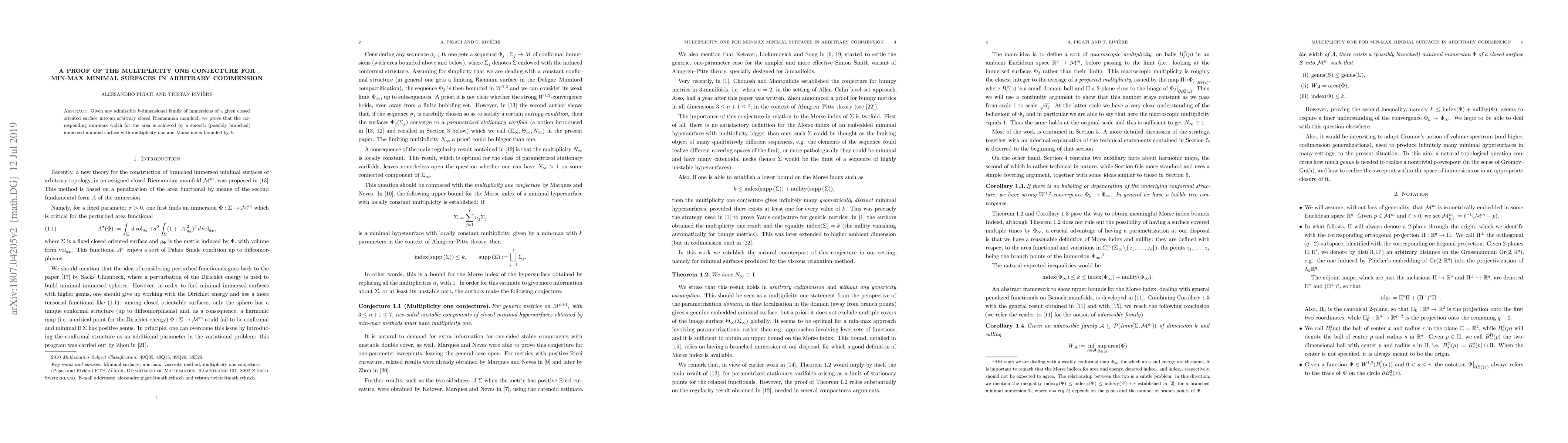 Given any admissible $k$-dimensional family of immersions of a given closed oriented surface into an arbitrary closed Riemannian manifold, we prove that the corresponding min-max width for the area is achieved by a smooth (possibly branched) immersed minimal surface with multiplicity one and Morse index bounded by $k$.