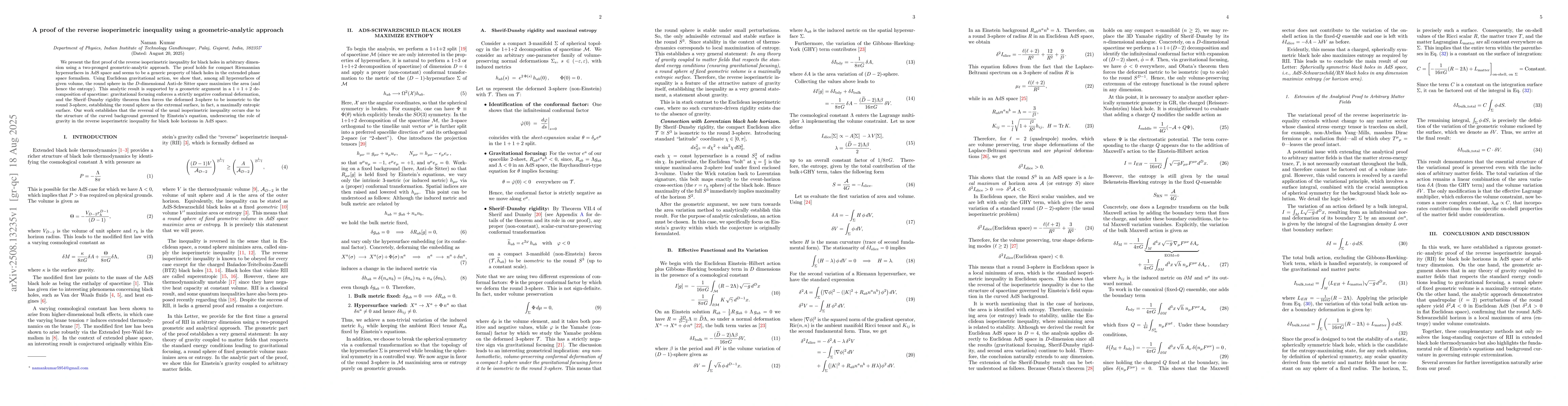 We present the first proof of the reverse isoperimetric inequality for black holes in arbitrary dimension using a two-pronged geometric-analytic approach. The proof holds for compact Riemannian hypersurfaces in AdS space and seems to be a generic property of black holes in the extended phase space formalism. Using Euclidean gravitational action, we show that, among all hypersurfaces of given volume, the round sphere in the $D$-dimensional Anti-de Sitter space maximizes the area (and hence the entropy). This analytic result is supported by a geometric argument in a $1+1+2$ decomposition of spacetime: gravitational focusing enforces a strictly negative conformal deformation, and the Sherif-Dunsby rigidity theorem then forces the deformed 3-sphere to be isometric to the round 3-sphere, establishing the round sphere as the extremal surface, in fact, a maximally entropic surface. Our work establishes that the reversal of the usual isoperimetric inequality occurs due to the structure of the curved background governed by Einstein's equation, underscoring the role of gravity in the reverse isoperimetric inequality for black hole horizons in AdS space.