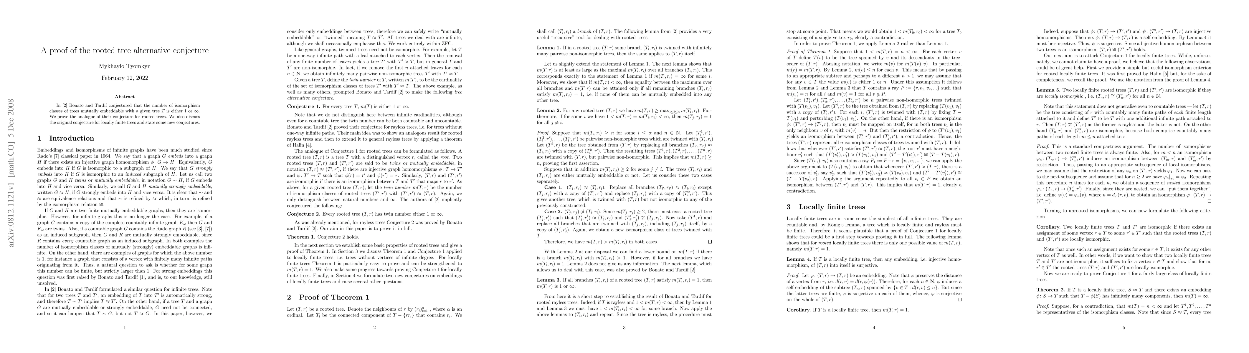 Researchers prove a conjecture about rooted trees, showing that the number of isomorphism classes mutually embeddable with a given tree T is either 1 or infinite. The study also discusses related conjectures for locally finite trees and presents new hypotheses.