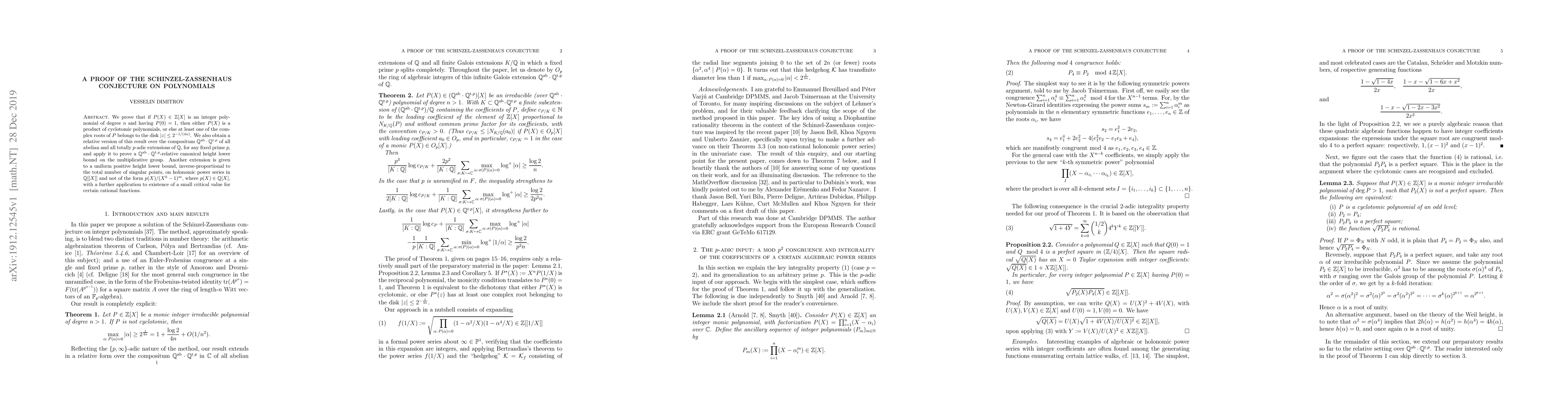 The paper presents a proof for the Schinzel-Zassenhaus conjecture on polynomials, stating that for certain conditions, polynomials either are products of cyclotomic polynomials or have roots in a specified disk. It also provides a relative version of this result over a compositum of number fields, leading to a height lower bound on the multiplicative group. The research extends to a uniform positive height lower bound for holonomic power series, with applications to the existence of small critical values for rational functions.