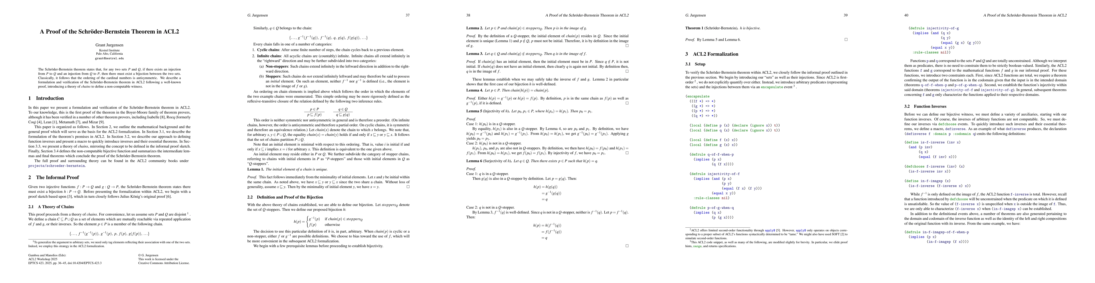 The Schr\"oder-Bernstein theorem states that, for any two sets P and Q, if there exists an injection from P to Q and an injection from Q to P, then there must exist a bijection between the two sets. Classically, it follows that the ordering of the cardinal numbers is antisymmetric. We describe a formulation and verification of the Schr\"oder-Bernstein theorem in ACL2 following a well-known proof, introducing a theory of chains to define a non-computable witness.