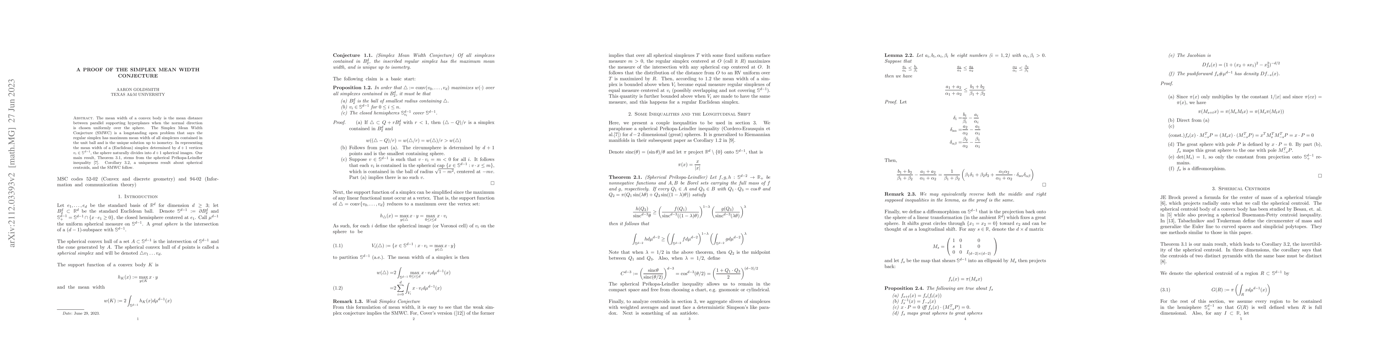 The mean width of a convex body is the average distance between parallel supporting hyperplanes when the normal direction is chosen uniformly over the sphere. The Simplex Mean Width Conjecture (SMWC) is a longstanding open problem that says the regular simplex has maximum mean width of all simplices contained in the unit ball and is unique up to isometry. We give a self contained proof of the SMWC in $d$ dimensions. The main idea is that when discussing mean width, $d+1$ vertices $v_i\in\mathbb{S}^{d-1}$ naturally divide $\mathbb{S}^{d-1}$ into $d+1$ Voronoi cells and conversely any partition of $\mathbb{S}^{d-1}$ points to selecting the centroids of regions as vertices. We will show that these two conditions are enough to ensure that a simplex with maximum mean width is a regular simplex.