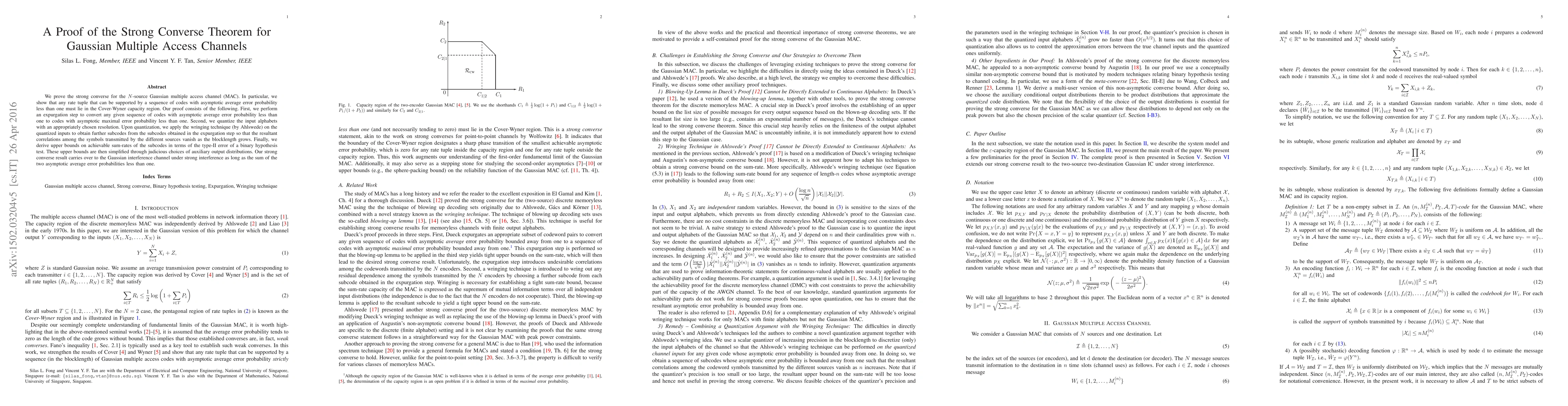 We prove the strong converse for the $N$-source Gaussian multiple access channel (MAC). In particular, we show that any rate tuple that can be supported by a sequence of codes with asymptotic average error probability less than one must lie in the Cover-Wyner capacity region. Our proof consists of the following. First, we perform an expurgation step to convert any given sequence of codes with asymptotic average error probability less than one to codes with asymptotic maximal error probability less than one. Second, we quantize the input alphabets with an appropriately chosen resolution. Upon quantization, we apply the wringing technique (by Ahlswede) on the quantized inputs to obtain further subcodes from the subcodes obtained in the expurgation step so that the resultant correlations among the symbols transmitted by the different sources vanish as the blocklength grows. Finally, we derive upper bounds on achievable sum-rates of the subcodes in terms of the type-II error of a binary hypothesis test. These upper bounds are then simplified through judicious choices of auxiliary output distributions. Our strong converse result carries over to the Gaussian interference channel under strong interference as long as the sum of the two asymptotic average error probabilities less than one.