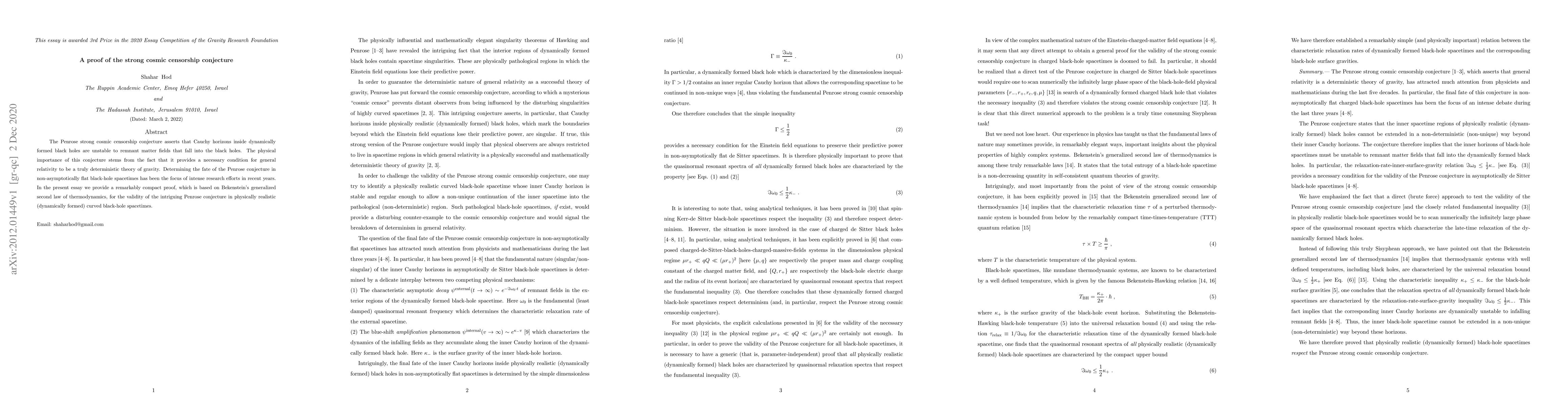 The Penrose strong cosmic censorship conjecture asserts that Cauchy horizons inside dynamically formed black holes are unstable to remnant matter fields that fall into the black holes. The physical importance of this conjecture stems from the fact that it provides a necessary condition for general relativity to be a truly deterministic theory of gravity. Determining the fate of the Penrose conjecture in non-asymptotically flat black-hole spacetimes has been the focus of intense research efforts in recent years. In the present essay we provide a remarkably compact proof, which is based on Bekenstein's generalized second law of thermodynamics, for the validity of the intriguing Penrose conjecture in physically realistic (dynamically formed) curved black-hole spacetimes.