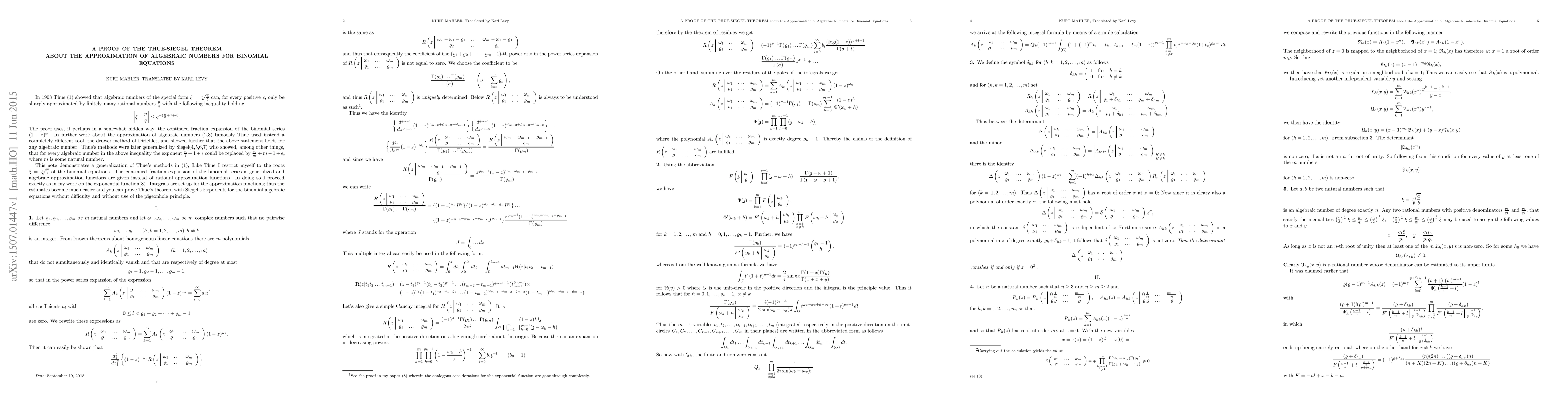 In 1908 Thue (1) showed that algebraic numbers of the special form $\xi =\sqrt[n]{\frac{a}{b}}$ can, for every positive $\epsilon$, only be sharply approximated by finitely many rational numbers $\frac{p}{q}$ with the following inequality holding \[ \left|\xi -\frac{p}{q}\right|\leq q^{-(\frac{n}{2}+1+\epsilon)} .\] The proof uses, if perhaps in a somewhat hidden way, the continued fraction expansion of the binomial series $(1-z)^\omega$. In further work about the approximation of algebraic numbers (2,3) famously Thue used instead a completely different tool, the drawer method of Dirichlet, and showed further that the above statement holds for any algebraic number. Thue's methods were later generalized by Siegel(4,5,6,7) who showed, among other things, that for every algebraic number in the above inequality the exponent $\frac{n}{2}+1+\epsilon$ could be replaced by $\frac{n}{m}+m-1+\epsilon$, where $m$ is some natural number. This note demonstrates a generalization of Thue's methods in (1); Like Thue I restrict myself to the roots $\xi =\sqrt[n]{\frac{a}{b}}$ of the binomial equations. The continued fraction expansion of the binomial series is generalized and algebraic approximation functions are given instead of rational approximation functions. In doing so I proceed exactly as in my work on the exponential function(8). Integrals are set up for the approximation functions; thus the estimates become much easier and you can prove Thue's theorem with Siegel's Exponents for the binomial algebraic equations without difficulty and without use of the pigeonhole principle.