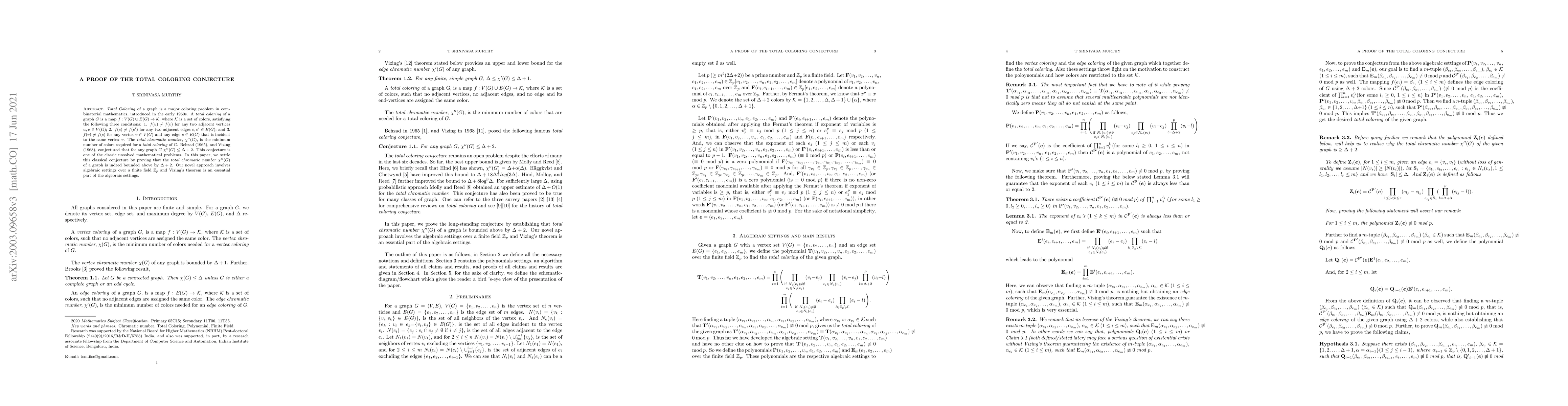 The paper presents a proof of the Total Coloring Conjecture using algebraic settings over a finite field Z_p, with Vizing's theorem as an essential component.
