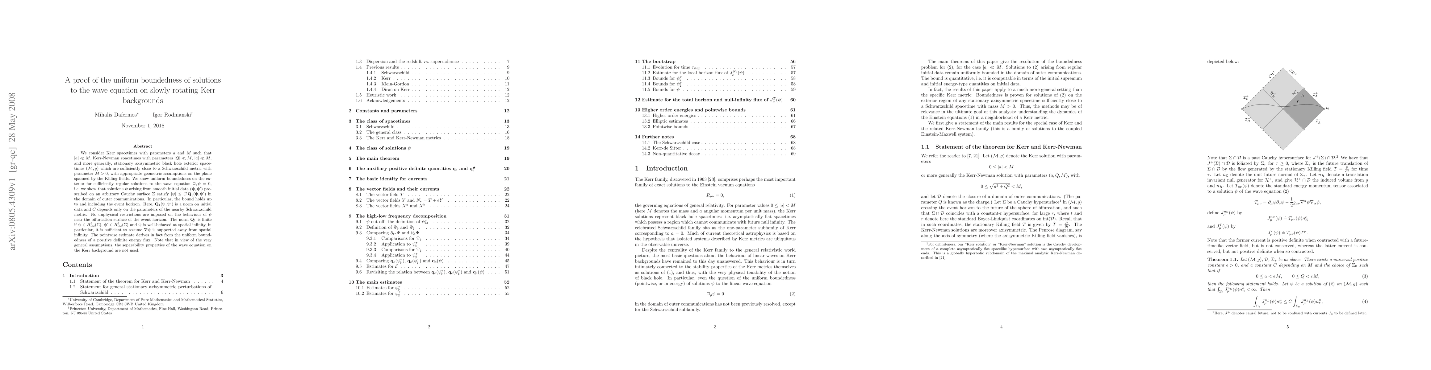 We consider Kerr spacetimes with parameters a and M such that |a|<< M, Kerr-Newman spacetimes with parameters |Q|<< M, |a|<< M, and more generally, stationary axisymmetric black hole exterior spacetimes which are sufficiently close to a Schwarzschild metric with parameter M>0, with appropriate geometric assumptions on the plane spanned by the Killing fields. We show uniform boundedness on the exterior for sufficiently regular solutions to the scalar homogeneous wave equation. In particular, the bound holds up to and including the event horizon. No unphysical restrictions are imposed on the behaviour of the solution near the bifurcation surface of the event horizon. The pointwise estimate derives in fact from the uniform boundedness of a positive definite energy flux. Note that in view of the very general assumptions, the separability properties of the wave equation on the Kerr background are not used.