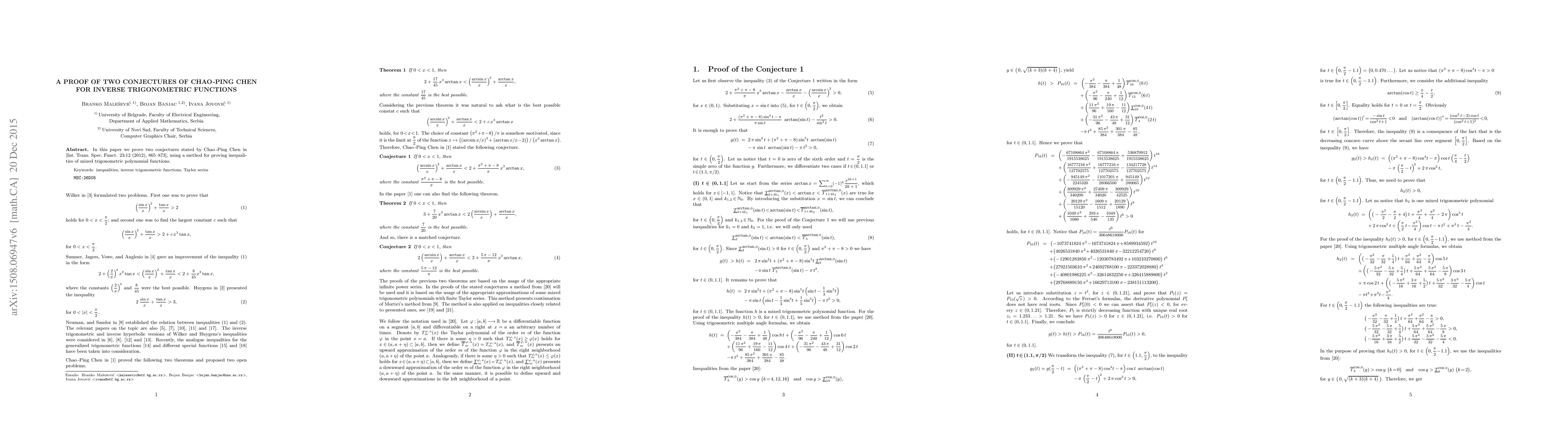 In this paper we prove two conjectures stated by Chao-Ping Chen in [Int. Trans. Spec. Funct. 23:12 (2012), 865--873], using a method for proving inequalities of mixed trigonometric polynomial functions.