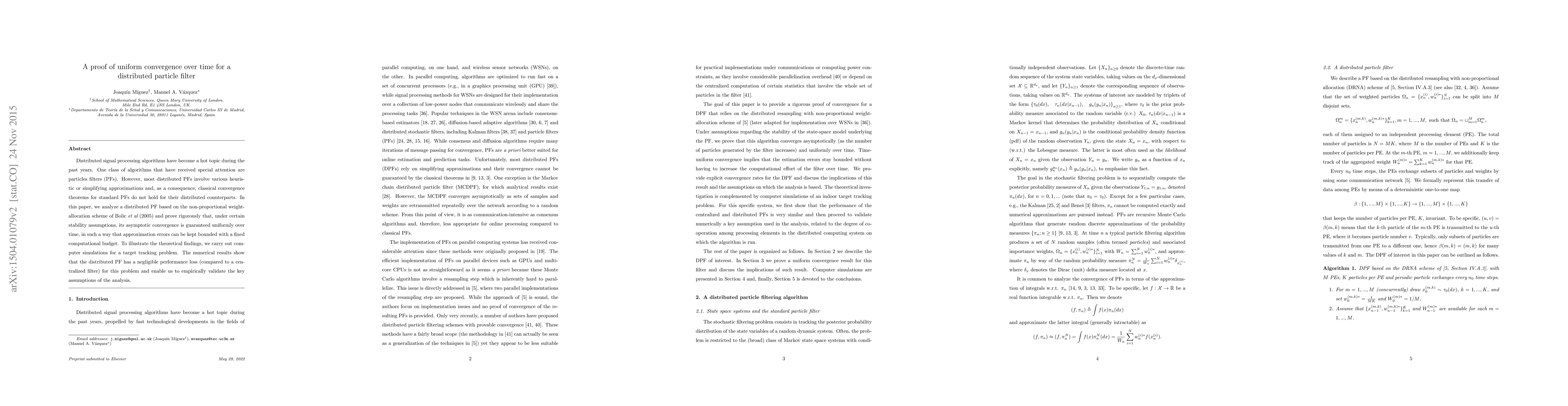 Distributed signal processing algorithms have become a hot topic during the past years. One class of algorithms that have received special attention are particles filters (PFs). However, most distributed PFs involve various heuristic or simplifying approximations and, as a consequence, classical convergence theorems for standard PFs do not hold for their distributed counterparts. In this paper, we analyze a distributed PF based on the non-proportional weight-allocation scheme of Bolic {\em et al} (2005) and prove rigorously that, under certain stability assumptions, its asymptotic convergence is guaranteed uniformly over time, in such a way that approximation errors can be kept bounded with a fixed computational budget. To illustrate the theoretical findings, we carry out computer simulations for a target tracking problem. The numerical results show that the distributed PF has a negligible performance loss (compared to a centralized filter) for this problem and enable us to empirically validate the key assumptions of the analysis.
