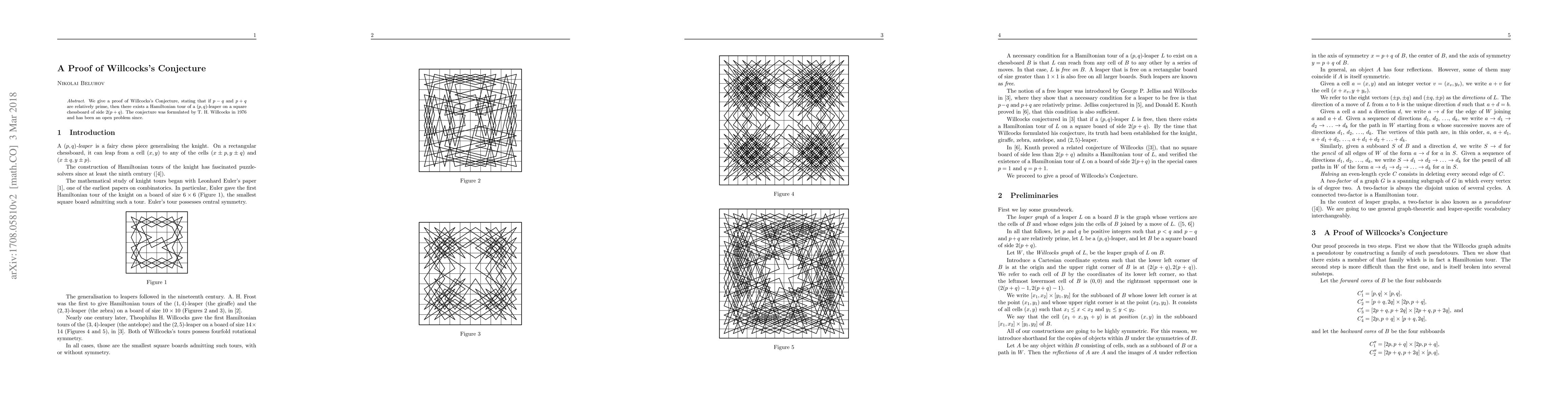 We give a proof of Willcocks's Conjecture, stating that if $p - q$ and $p + q$ are relatively prime, then there exists a Hamiltonian tour of a $(p, q)$-leaper on a square chessboard of side $2(p + q)$. The conjecture was formulated by T. H. Willcocks in 1976 and has been an open problem since.
