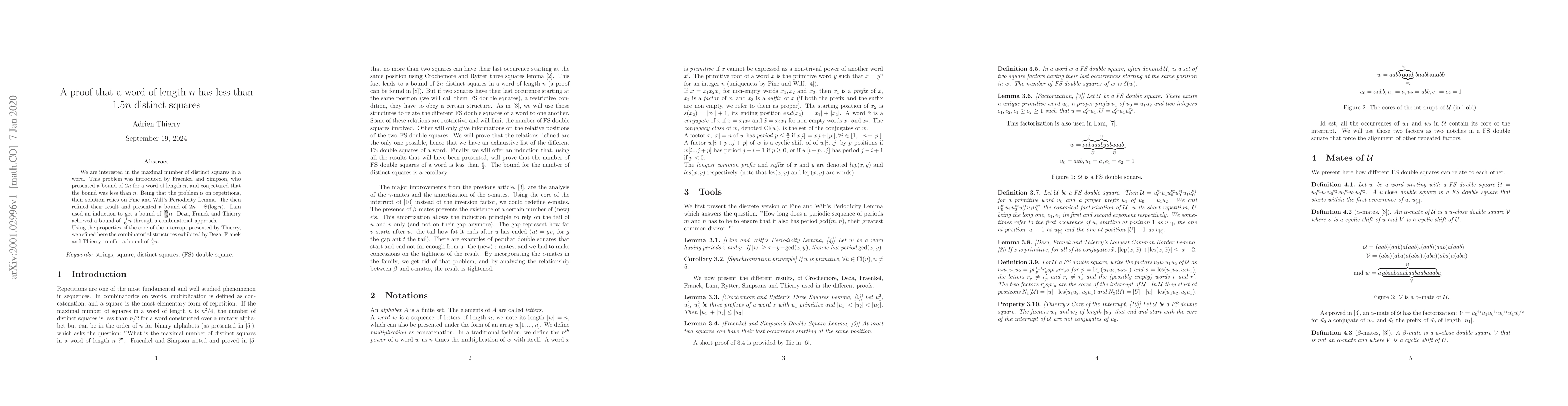 A new bound of 3n/2 distinct squares has been proven for a word of length n, improving upon previous bounds of up to 2n.